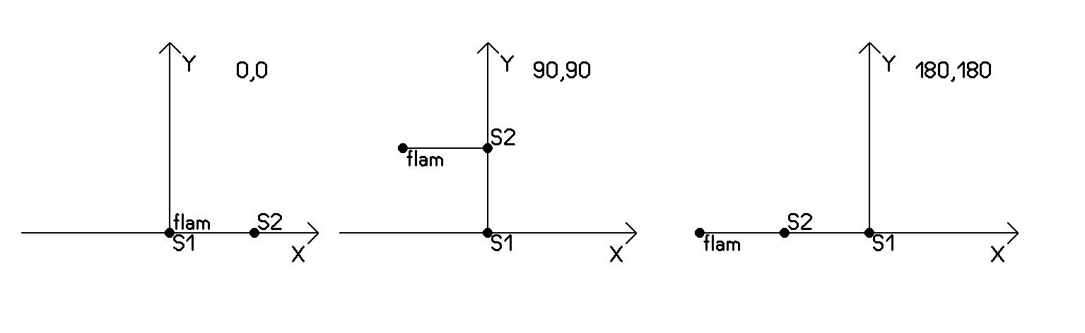 S1 положение вала первой сервы (начало координат, эта серва неподвижна),S2- вал второй сервы (эта серва подвижна),flam- положение стержня фломастера. Конечно серва не станет в 190 градусов потому что вычисленный угол уходит далеко за данные значений х и у. Его никак не должно получаться в границах координат рабочего поля. Для другого манипулятора, с другими начальными посадками серв и поля пожалуйста, это уже нюанс, который устанавливает сам владелец манипулятора - задаёт границы допустимых значений координат или углов.