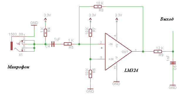 удобная схемка предварительного усилительного каскада на микрофон, но она нужна по моему мнению для полноценной обработки звука...для схемы дунул-крутится излишняя..