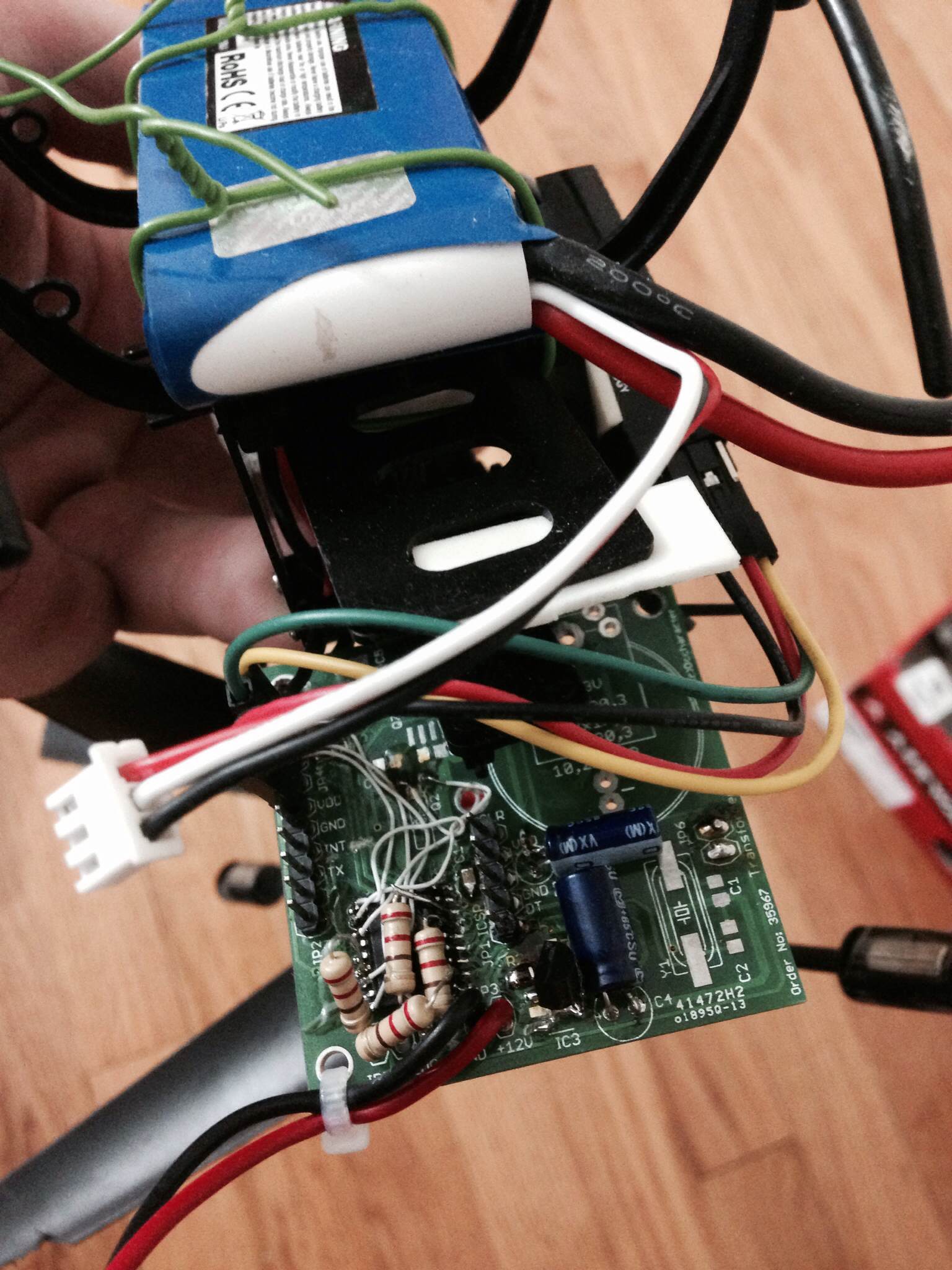 В оригинале стоит плата, которая принимает сигнал, разбирает его на каналы: - управление маломощным движком (тангаж вертолета) - управление винтами (высота, рыскание) - управление камерой Все питается от одного лития, т.е. 3.7В (надо, кстати, проверить, нет ли там накачки до 5-6 вольт)