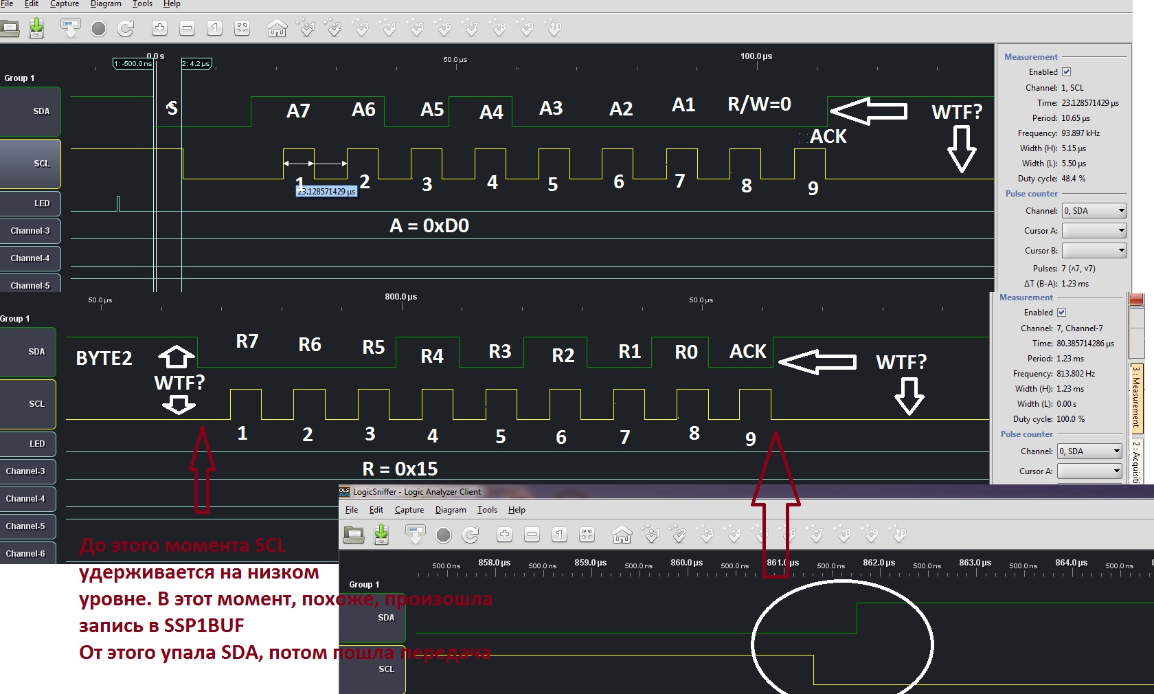 dccharacter писал(а):Вот удалось частично поймать мастер на передаче. Странное поведение линии SDA между пересылкой байтов, она, почему-то, отпускается. А судя по даташиту - не должна.