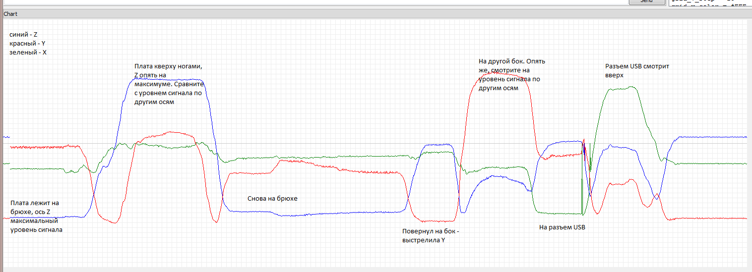 А, нет, обманул я себя и вас. Синий - это Y, красный - Z, зеленый - X. При этом поведение вообще страннейшее. При перевороте плты кверх ногами знак меняется, т.е. направление вектора меняется на 180 градусов. Но при вращении без поворота значение не меняется вообще.