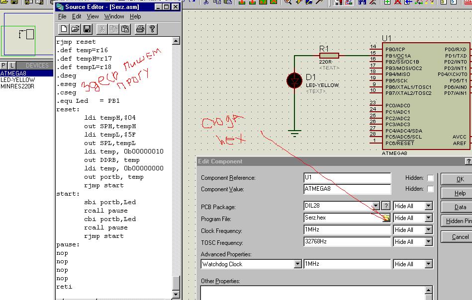 в протеусе открой исходник программы (t15demo.asm)