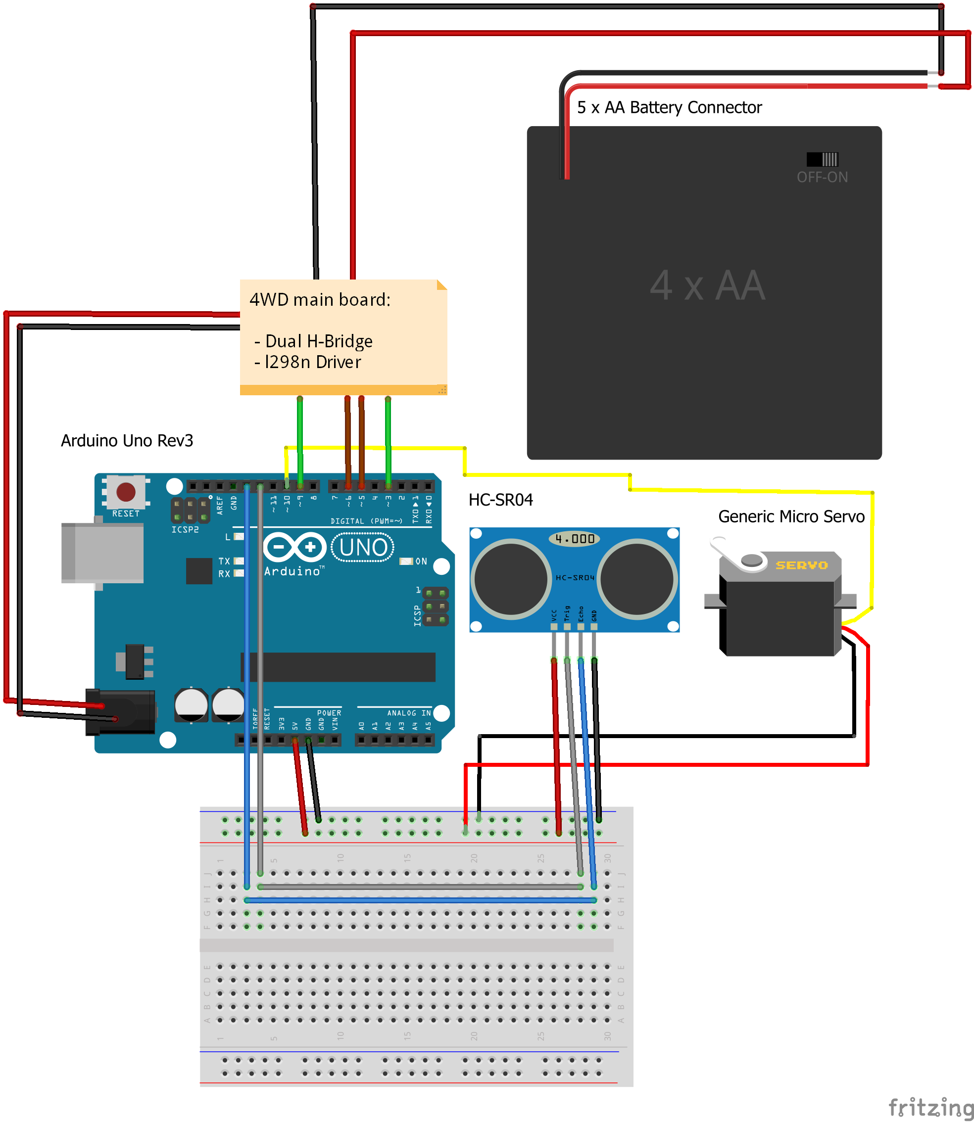 Я сделал простую схемку на Fritzing, ее можете найти в вложениях. По схеме все соединил и робот стал выглядеть как настоящий придурок, соответственно назвал его Freax (с англ. freak - придурок).