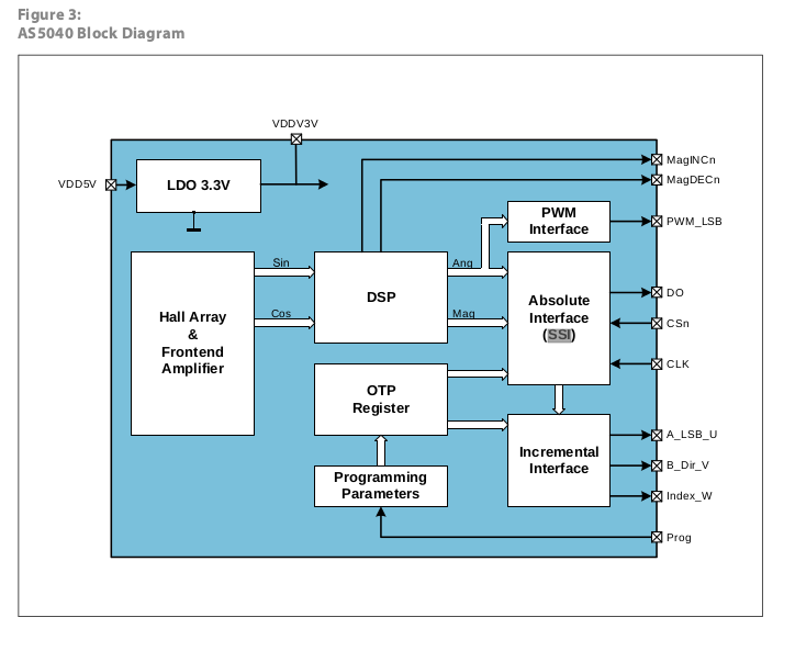 The AS5040 senses the orientation of the magnetic field and calculates a 10-bit binary code. This code can be accessed via a Synchronous Serial Interface (SSI). In addition, an absolute angular representation is given by a Pulse Width Modulated signal at pin 12 (PWM). Besides the absolute angular position information the device simultaneously provides incremental output signals.