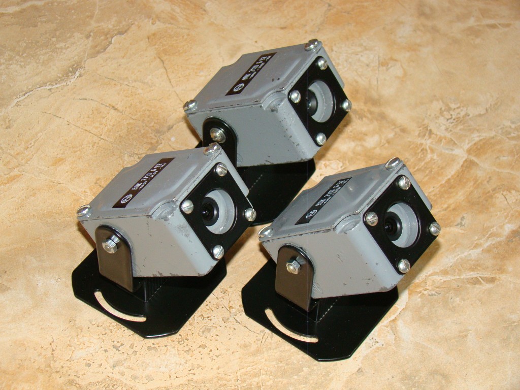 Видеокамеры. Корпусами для них служат старые концевые выключатели, кронштейны вырезал из алюминия.