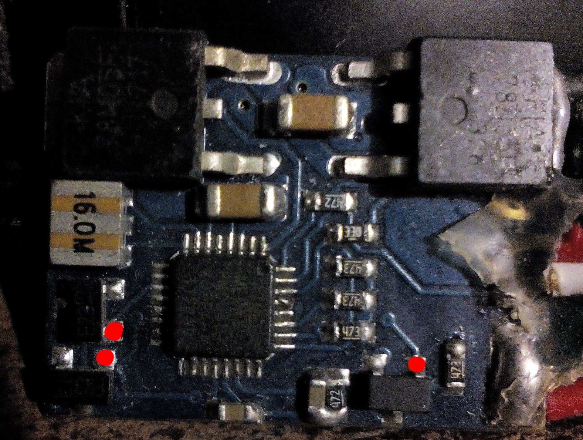 красными точками отметил места куда вроде как надо припаивать плюсовой сигнал на управление мосфетами.