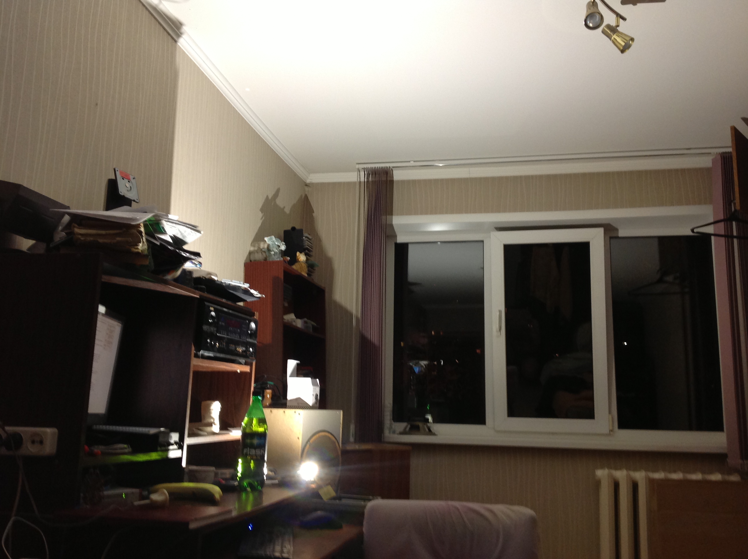 вот дома от 12В БП компа, единственный источник света в комнате, направлен в потолок, правда для СД это несколько не режим, там току вваливается под ампер, что для него максимум.