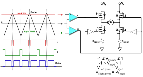 в случае если задание 100, на другом, соответственно 0ff, то в первую половину периода - оба включены - и соответственно замыкают обе клеммы мотора на + линию, во второй половине - открыты оба нижних... лишь разница в такт может быть, и то ее можно погасить арифметикой.. ну и по скольку ШИМ в режиме phase correct - то это повторяется еще раз в обратном порядке ...