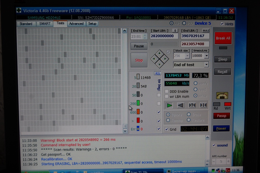 вижу "warning! block start at 2820548992", жму стоп, ввожу в start lba 2820000000 и запускаю стирание. как видно по фотке на втором проходе в тех секторах уже не ругается, т.е. всё кхарашо.