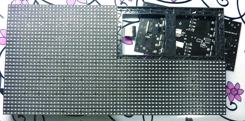 подобных модулей полно, есть и побольше и поменьше. допустим 64*ргб 32точек, 256x128мм стоят по рознице на али от 16$. электроника тоже может быть очень разной. управление очень простое, обычно это "сканирование строк". для строк дешифраторы, защёлки,... после которых транзисторы. а на столбцы всякая стандартная логика или драйверы различной навороченности. в этом модули стоят аналоги mbi5024/mbi5026/... это по сути это логика сдвига у которого резистором настраивается ограничение максимального тока на выходах. для общего понимания управление примерно такое - сбрасываем сдвиг, на дешифраторе выбрали первую строку, вогнали данные первой строки и "защёлкнули" сдвиг. всё, первая строка отображается. ждём, сколько ей там нужно светиться, потом сбрасываем сдвиг, выбираем на дешифраторе вторую строку, вгоняем в сдвиг данные второй строки, "защёлкнули" сдвиг. и т.д. все строки.