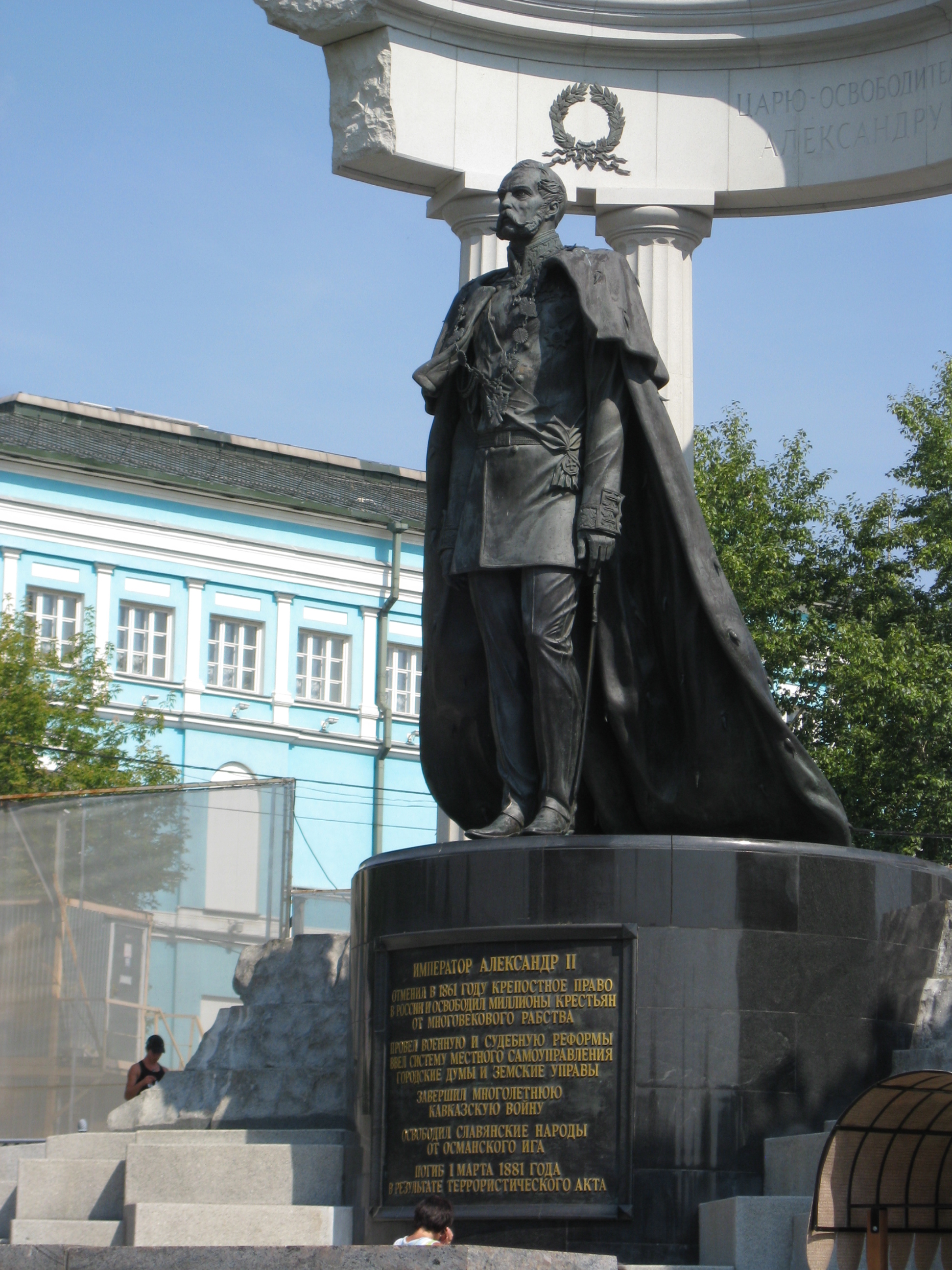 Здрав Будте Бояре! Давно я тут ни чего не писал, вот собственно пока время свободное есть (каникулы у меня идут сейчас) напишу я вам отсчёт как я август свой провел если кому интересно конечно. В августе этого года, а точнее 12 числа я полетел в Москву прямым рейсом из Омска на Международный Авиа Космический Салон МАКС 2011. Меня, моих товарищей и преподавателя пригласили туда как участников выставки детского творчества "Ф2-От Винта". Время 15.20, место - Москва, Шереметьево. Прилетев в столицу, мы захватив багаж, пошли покупать билет на электричку до Белорусского вокзала. Сели и приехали. Время 16.10, место - Белорусский вокзал, перрон. Потопали мы искать метро, народу много все идут кто куда, толпа меня буквально говоря взяла и принесла ко входу к станции метро. Время 16.20, место - станция метро Белорусская, касса. Стоит толпа у кассы непонятно где очередь начинается и кто крайний, ну как говориться: "Наглость-второе счастье". Всё купил билет, иду к турникету и сразу вспоминая мой любимый мультик "Ну, погоди!", когда волку турникет хвост оторвал, ну я собственно подставляю билет к сканеру вроде всё норм одна поездка, начинаю проходить, как вдруг он шибает мне по коленям, а главно попал в больное место гад такой и ещё музыка такая противная заиграла, ладно я снова на него попёр, а он опять шибанул, и так ещё 2 раза, я уже давай ему свой чемодан в жертву придавать, а он всё не пускает, но тут заметил всё это притивостояние полиционер и пропустил меня через турникет. Ну ктож знал что надо к правой стенке турникета прикладывать, а не к левой? И с тех пор я турникетам не доверяю, уж больно и точно они бьют по ногам. Время 16.30, место-Stairway to hell. Я таки эскалаторов в жизни ни видел! Ты по нему едешь. а конца пути не видишь! Аж страшно стало, долго ещё так едешь, а конца не видно, но тут думаешь всё вот она площадка моей мечты, вот она, но нет ещё один эскалатор в вниз! Кажется как будто в преисподню едешь, а потом узнал что нахожусь на девять этажей вниз под землей. Много, очень много. Само метро мне вскоре очень понравилось, прям атракцион такой и весело главное. Время, да вечер уже. Ну всё приехали в свою гостиницу скинули вещи и я начал осматривать местную обстановку, а обосновались мы близ станции метро Ясенево, очень красивое место. До самой выставки нам оставалось 4 дня и провели мы их на экскурсиях по Москве. На самой первой экскурсии мой преподаватель Александр Николаевич как позже выяснилось сломал ногу, когда фотографировал памятник Александру 2, он упал с 7 ступеньки, фото прилагается: