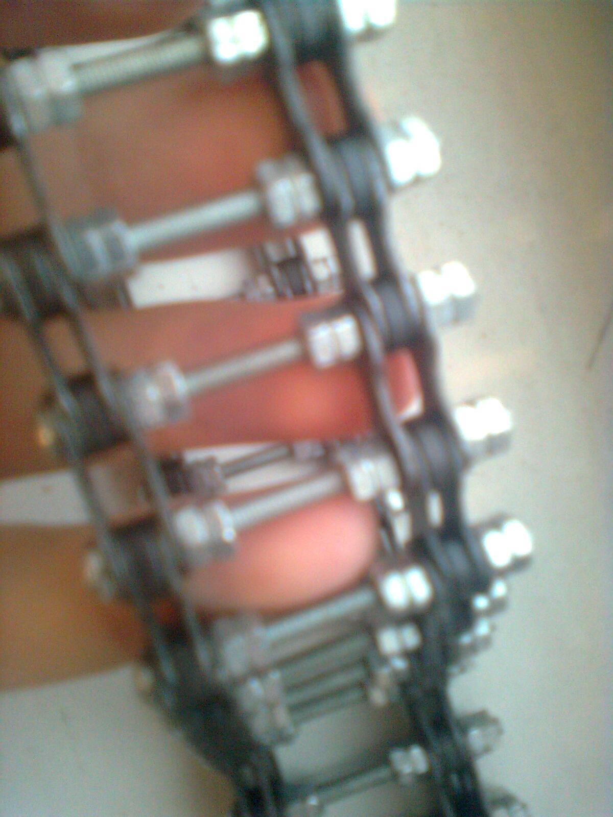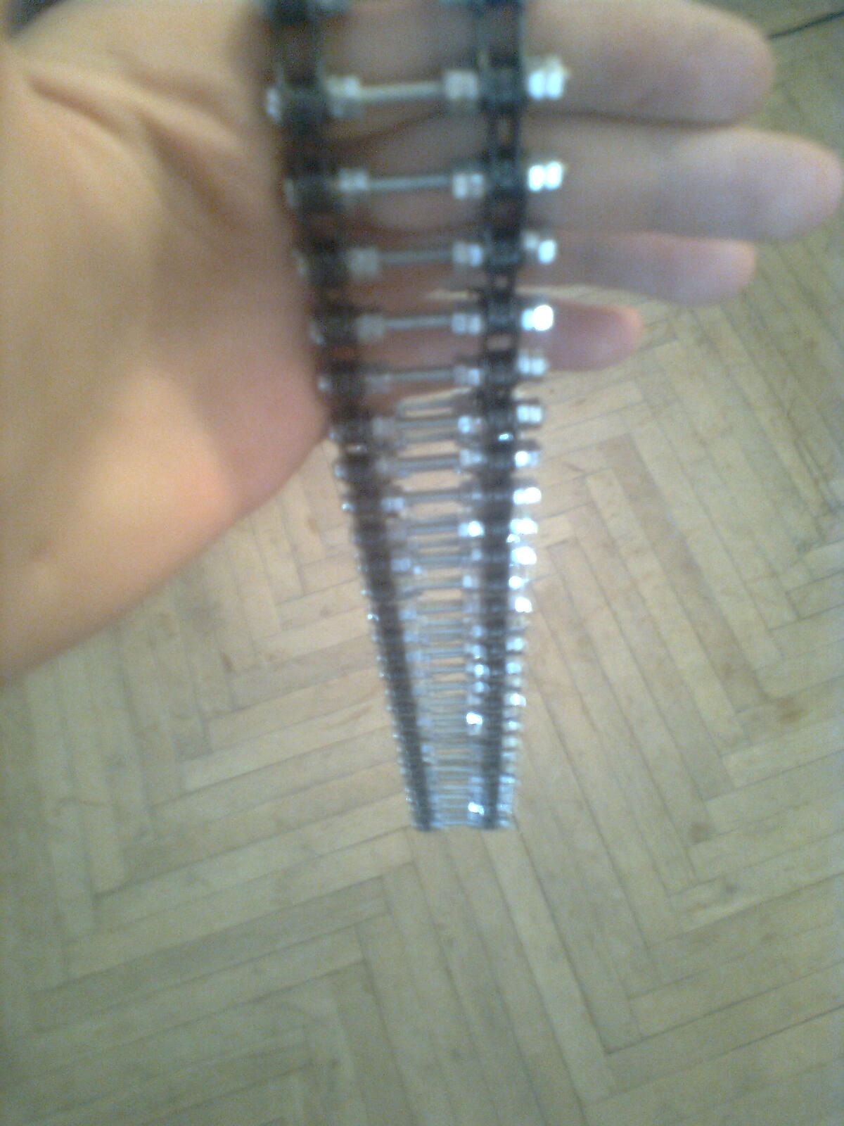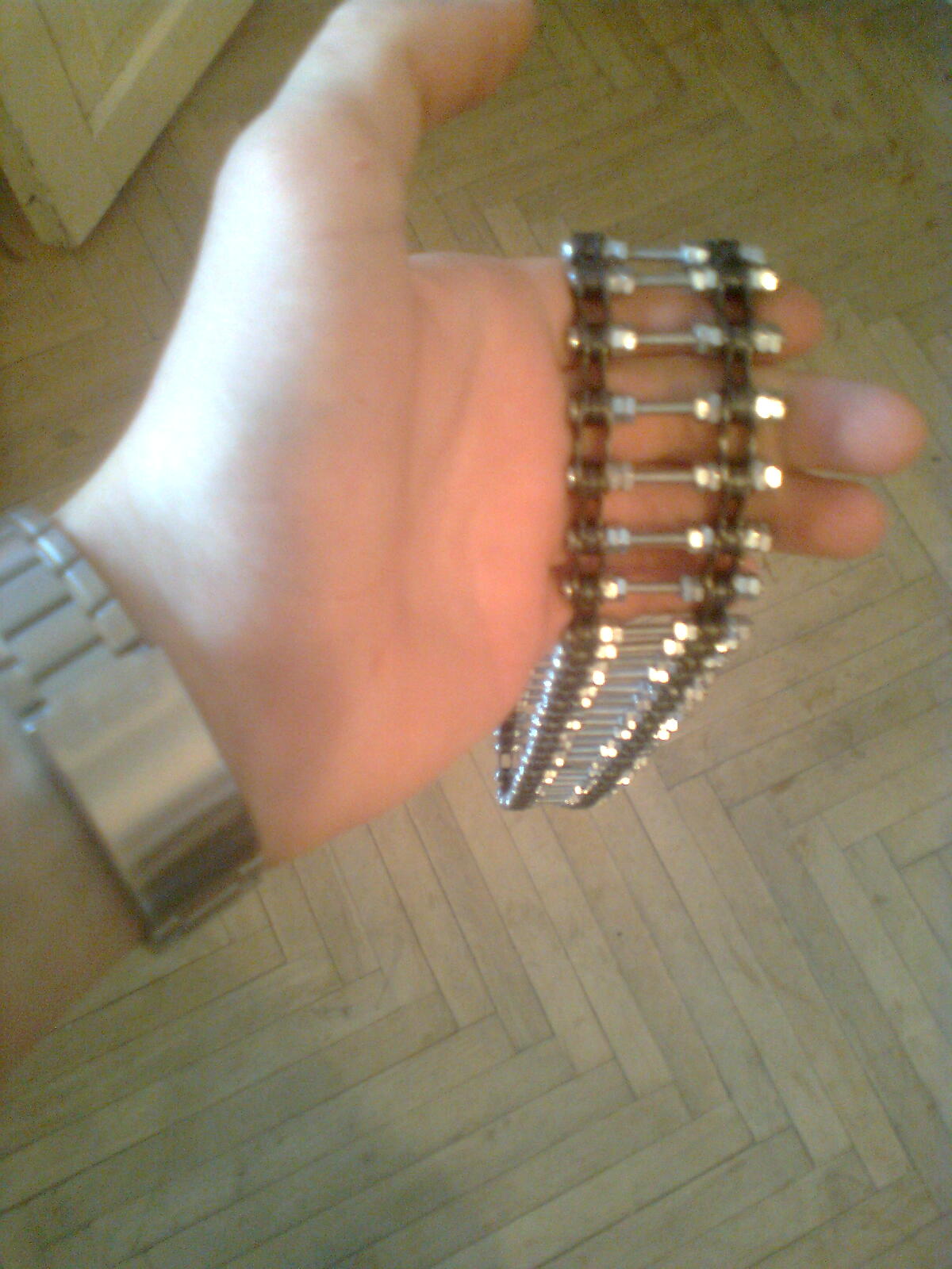 Взял за 20 грн велоцепь на рынке (новую) сказал чт омне нужнна цепь для спортивного велика, что взади 7 звезд (там просто толщина разная у цепей, я прикинул что если не проканает - хоть на велик себе новую цепь зацеплю) так вот. Купил винтов (болтов) м3 - то есть там где резьба 3 мм диаметр. длинной 40 или 45, не помню (сижу в библиотеке в универе, так как на хате пока что интернета нету., по этому померять щас не могу). Взял молоток, плоскогубцы, и гвоздь и уже через 10 мин. в цепи не было ни одного колышка, кстати, наловчился выбивать колышки офигенно. потом взялся закручивать вместо колышков эти болты и по 2 гайки ограничивающие, ну что бы не пережать цепь (и не сделать её негнучкой) и что бы не откручивались болты. Вот и принципе и все.