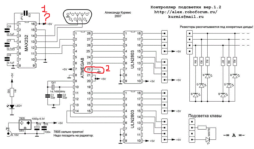 Вот схема и плата версии 1.5 - это немного переработанная 1.2, но с нормальной схемой и отдельным стабилизатором питания диодов. Кое-где добавил конденсаторов и немного ужал размеры платы.