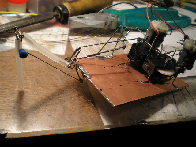 XEOn8 писал(а):Долго сидел, думал над конструкцией(делаю нового таракана, более жизнеспособного и крепкого), но как-то туго идет.. в общем сейчас есть разве что готовая основа, с редукторами и коленовалами.. сижу думаю, как его бегать заставить, у меня 2 двигателя - по одному на каждую сторону, 2 коленовала соответственно с 3мя коленами через 120 градусов(по одному колену на ногу).. одна тестовая нога, которая крутится просто так вперед-назад, так, для осмысления происходящего.. вот собственно и вся картина, твой принцип движения не подходит, а свой при таких мелких масштабах не катит.. сижу в раздумьях.