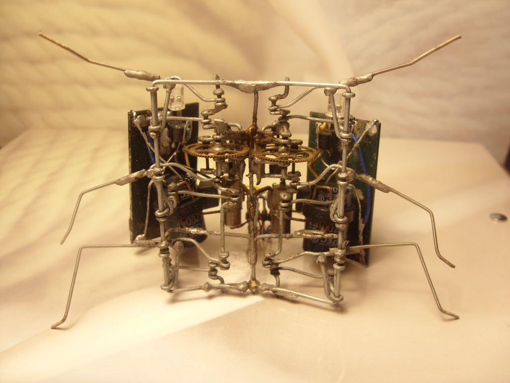 ( :((( я так и не научился гнуть и паять скрепки, никто не научил. сделал ходулехода (двуногого) по принципу как у сергея из линолиума, кудато полз, но очень медленно)