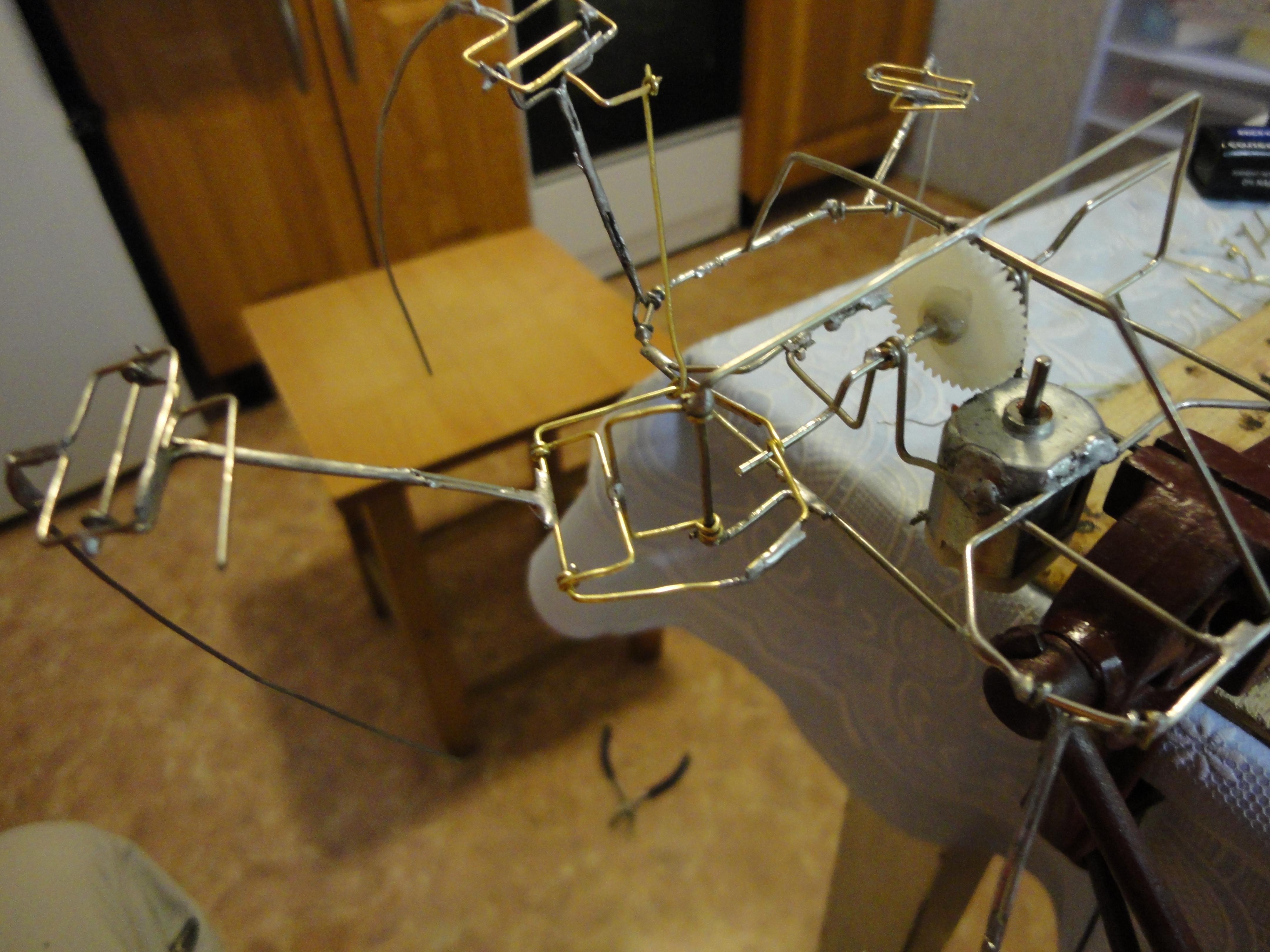 Походу у меня все вообще не верно, и никак не переиграть уже а по фоткам дак все также идет таже рама такие же ноги.... Сейчас сделал вот что со своим, расшил немного раму, тем самым сделал ось кривошипа посередине. Решил попробовать сваять "весло" хотяб на один борт и подумать что да как действовать дальше. Спаял, изогнул, добился чтоб не клинило. Вроде поворачивает, и немного задирает ногу. Тяги крутил вертел но так и не додумался куда цеплять.