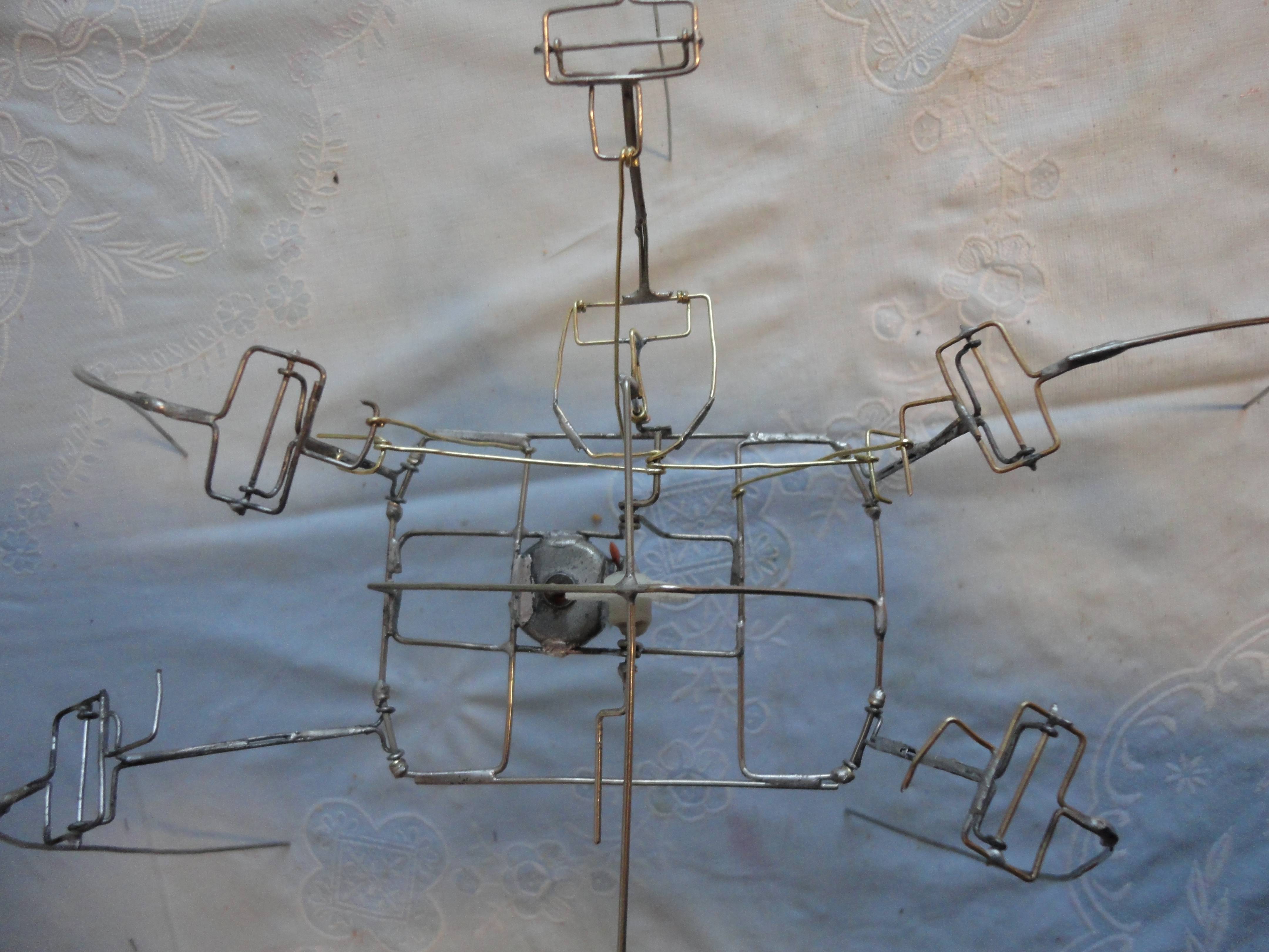 Почти получилось... почти. почти даже ходит, но инвалид. Вот что получилось изготовить за сегодняшний вечер, перекроил заново весла средних лап, сделал аккуратнее и одинаковые. Протянул тяги ко всем лапам от кривошипов, рассчитать как они должны я не знаю как, расставил по симметрии по одному положению кривошипа (тут нужна подсказка). Сами ноги тоже пока не понял какой надо длины делать и одинаковы ли они все, сделал одинаковыми по длине и конфигурации (тут тоже нужна подсказка). Вобщем вот фото: