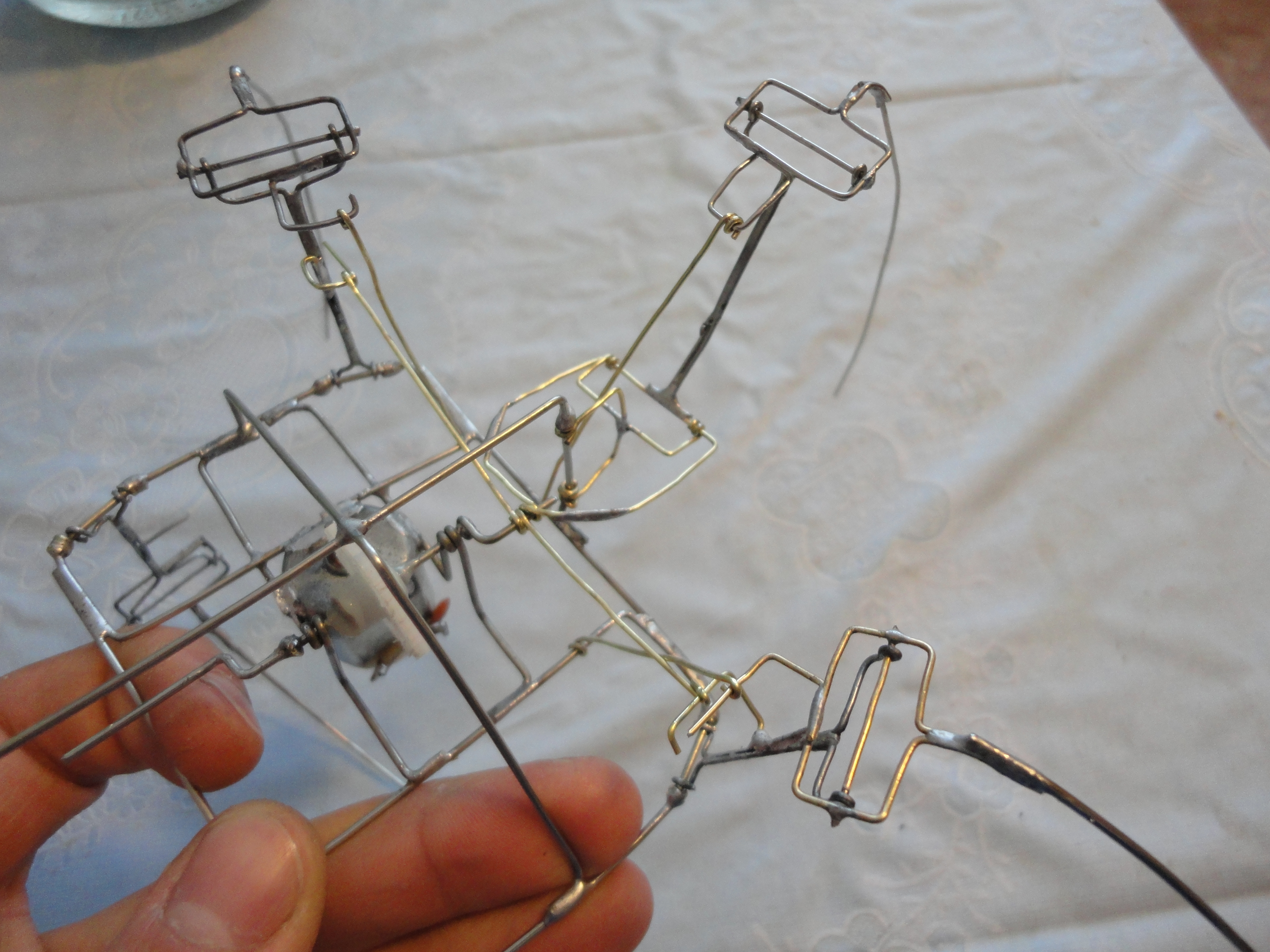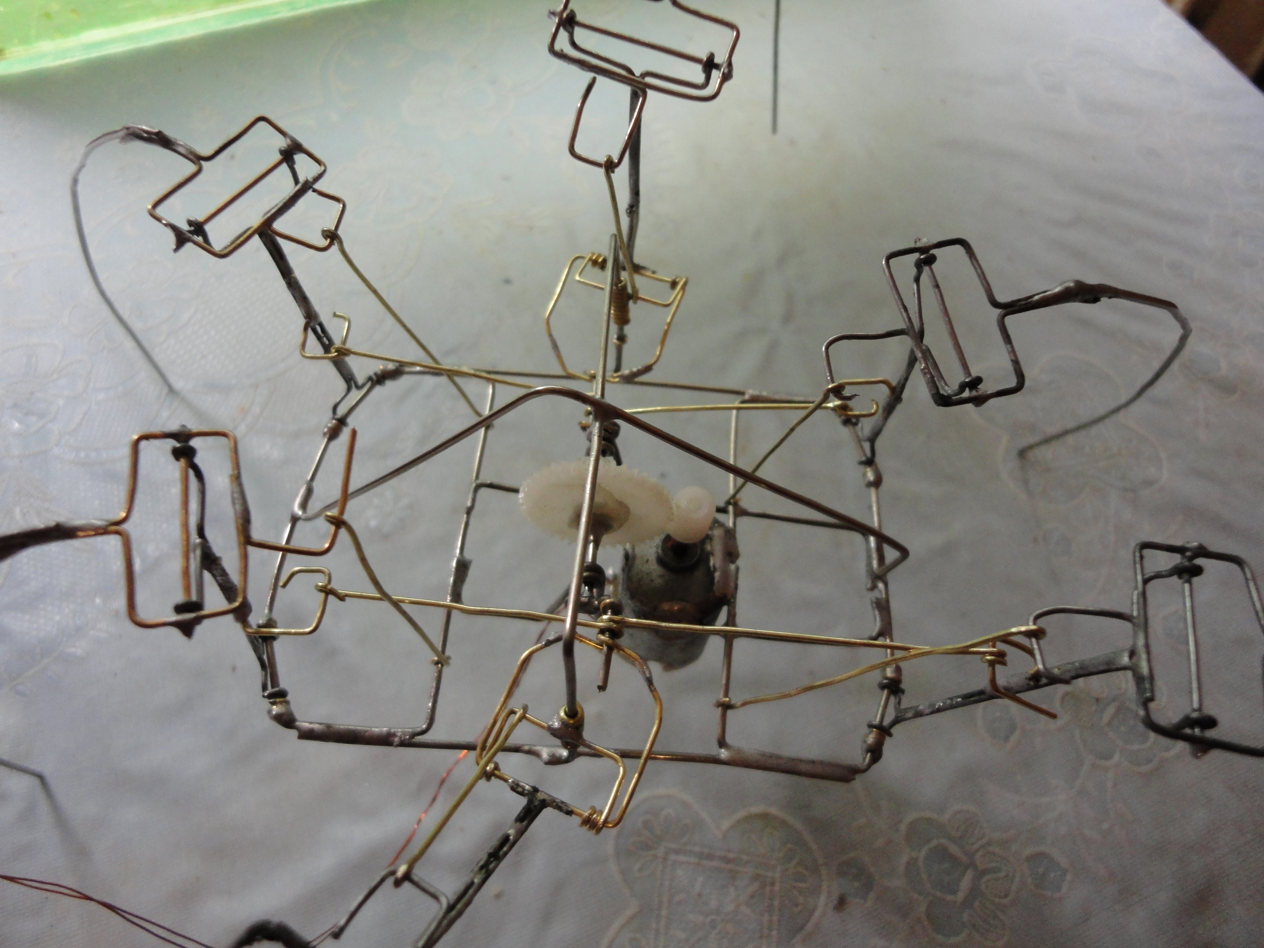 Почти получилось... почти. почти даже ходит, но инвалид. Вот что получилось изготовить за сегодняшний вечер, перекроил заново весла средних лап, сделал аккуратнее и одинаковые. Протянул тяги ко всем лапам от кривошипов, рассчитать как они должны я не знаю как, расставил по симметрии по одному положению кривошипа (тут нужна подсказка). Сами ноги тоже пока не понял какой надо длины делать и одинаковы ли они все, сделал одинаковыми по длине и конфигурации (тут тоже нужна подсказка). Вобщем вот фото: