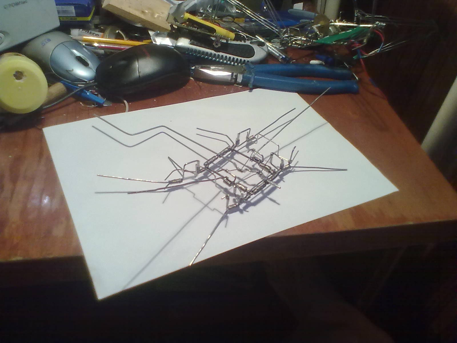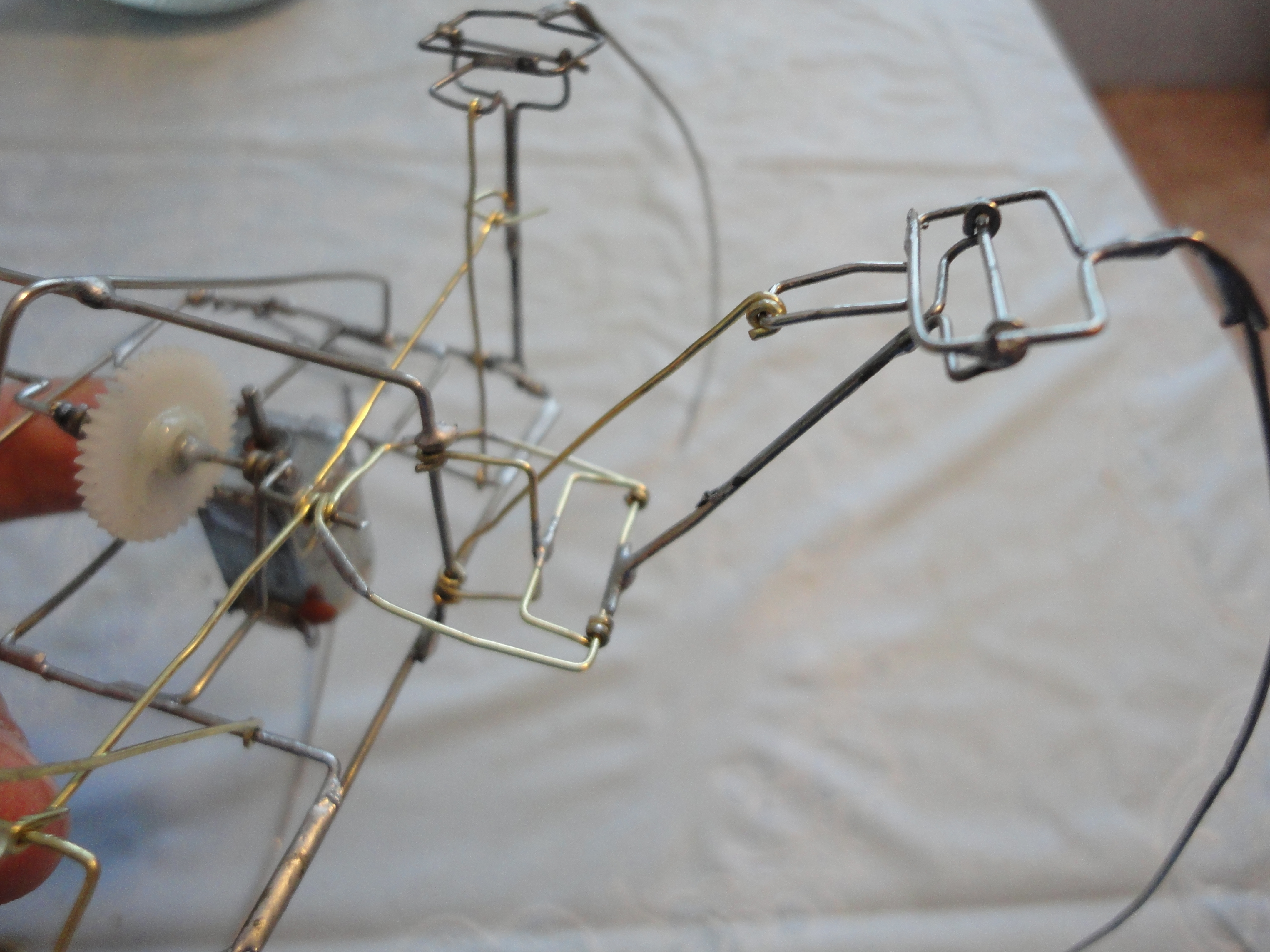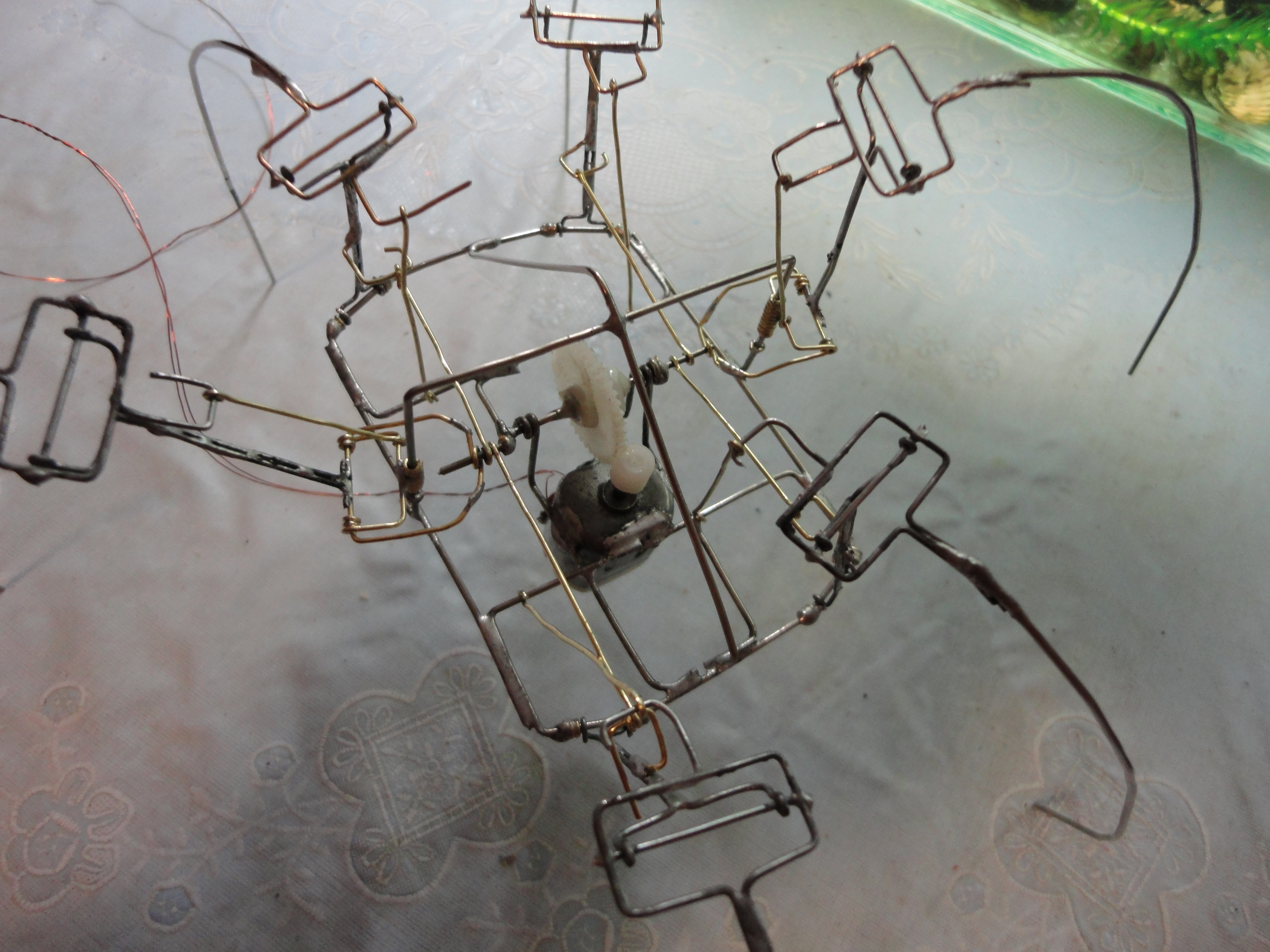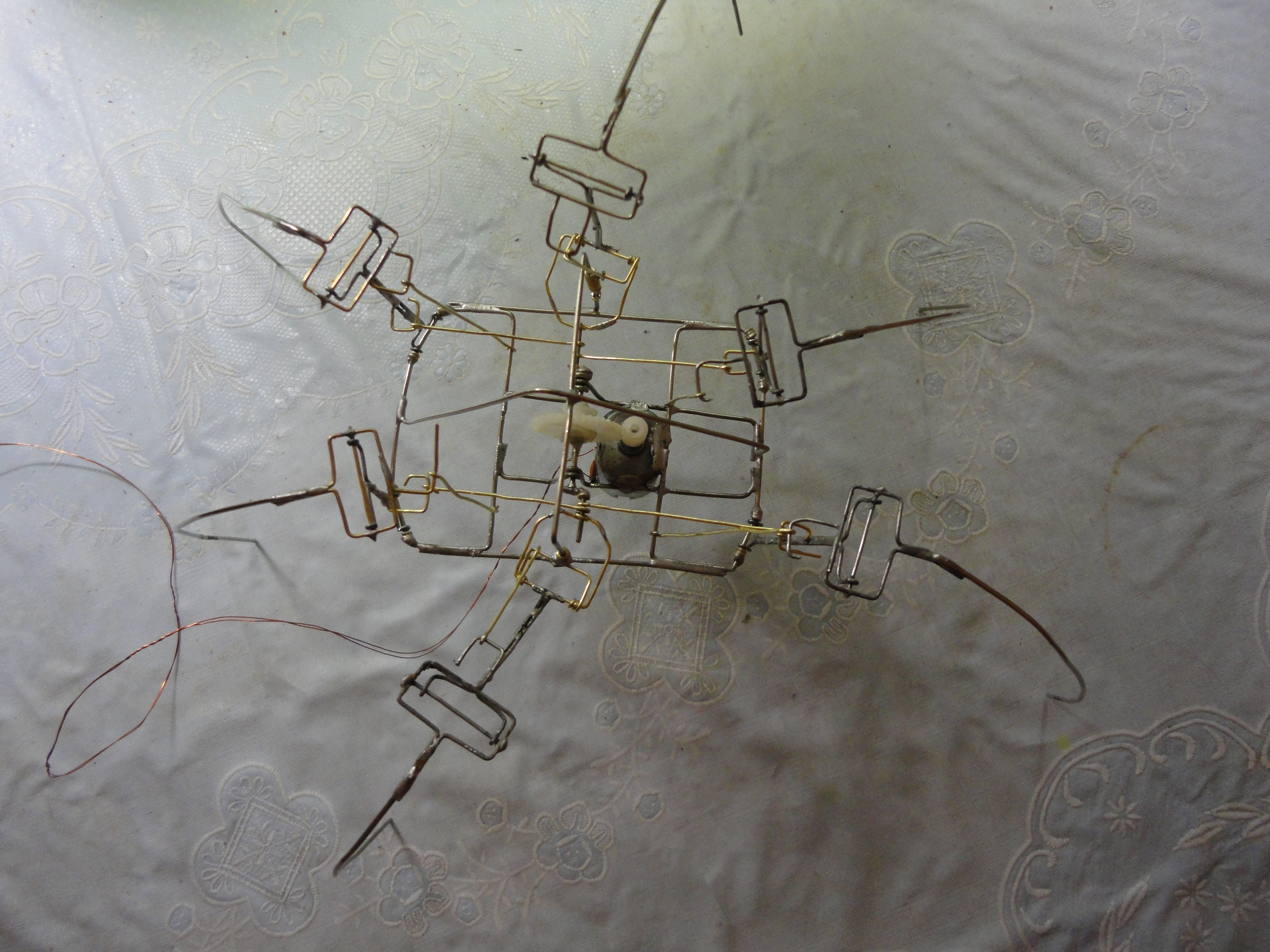 Почти получилось... почти. почти даже ходит, но инвалид. Вот что получилось изготовить за сегодняшний вечер, перекроил заново весла средних лап, сделал аккуратнее и одинаковые. Протянул тяги ко всем лапам от кривошипов, рассчитать как они должны я не знаю как, расставил по симметрии по одному положению кривошипа (тут нужна подсказка). Сами ноги тоже пока не понял какой надо длины делать и одинаковы ли они все, сделал одинаковыми по длине и конфигурации (тут тоже нужна подсказка). Вобщем вот фото:
