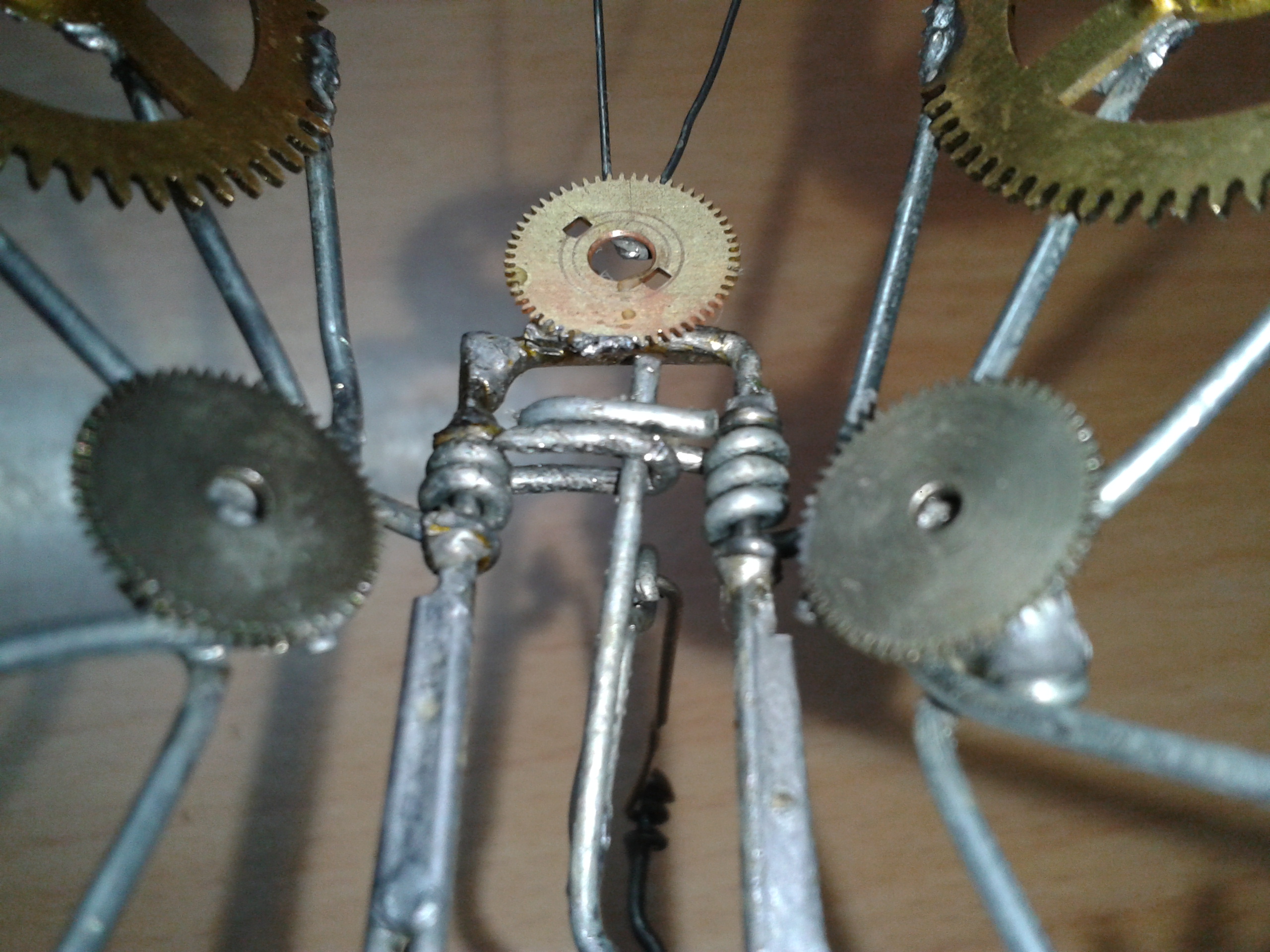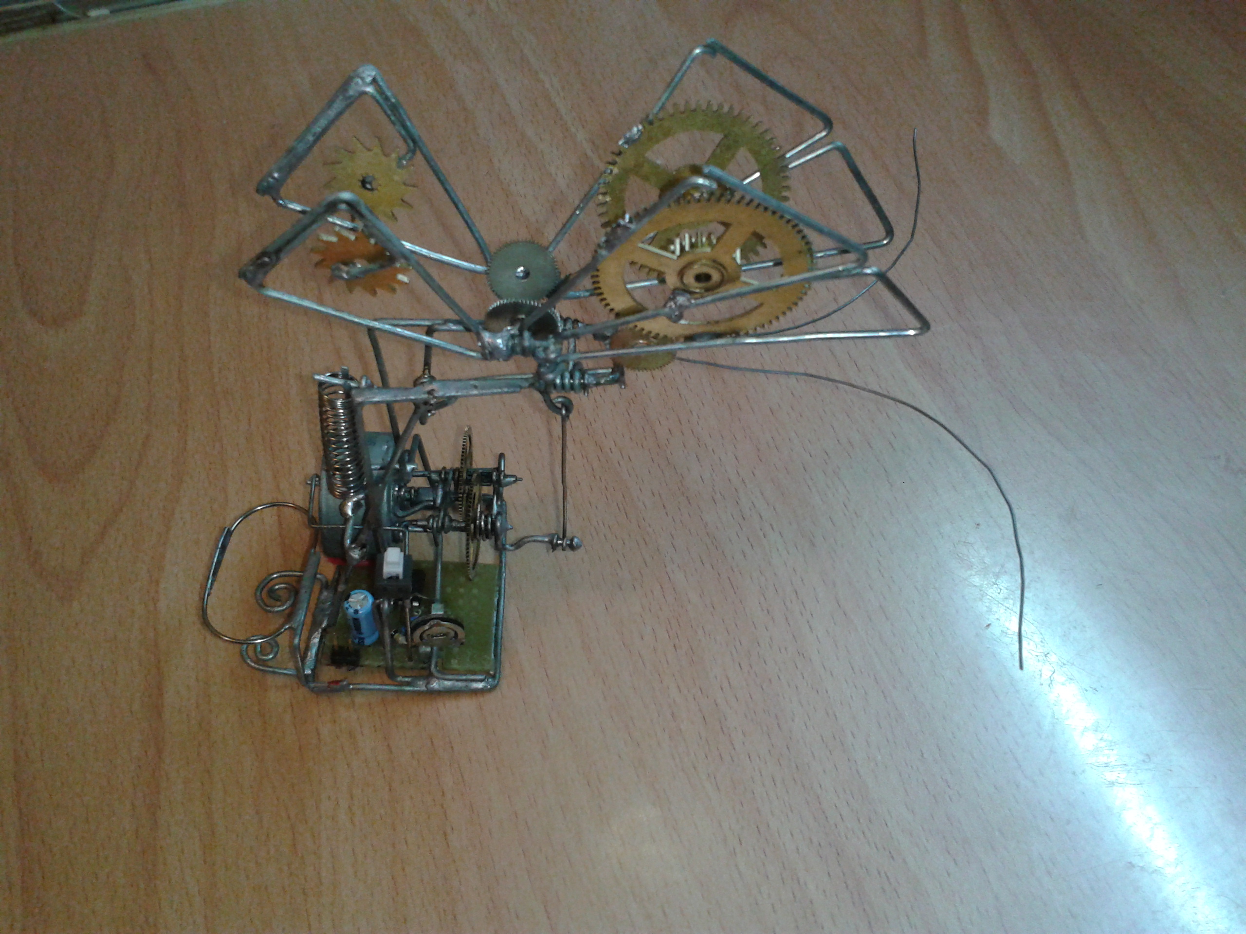 Простите немного отвлеку Вас своей безделушкой , это конечно не паучок со сложной механикой, а так баловство для разнообразия поделок, даже стилем "стимпанк" попахивает немного ну хватит с прелюдией перейдем к делу. Что мы умеем делать, а мы умеем делать только одно - это махать крыльями , но с цикличностью примерно 20-30 сек. машем, потом 5 сек. отдыхаем, разное время работы связано наверно с питанием микрочипа, вместо нужных 5 V у меня батарейка 2,4 V.