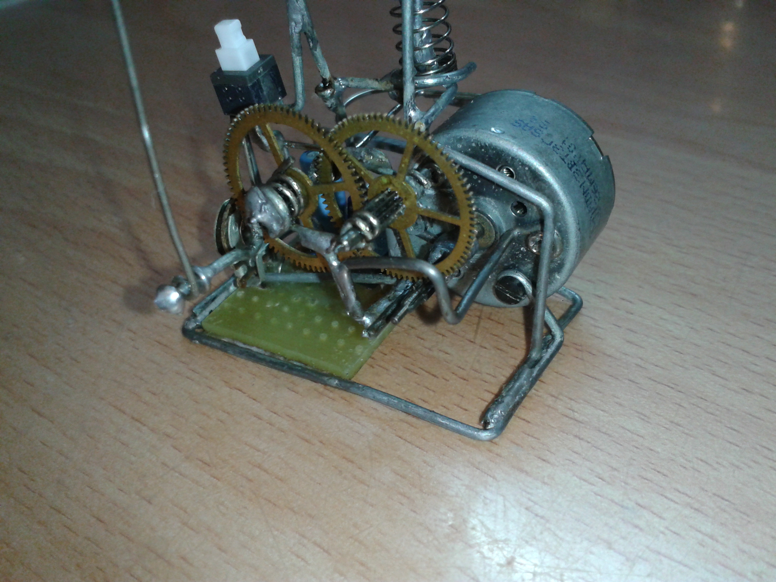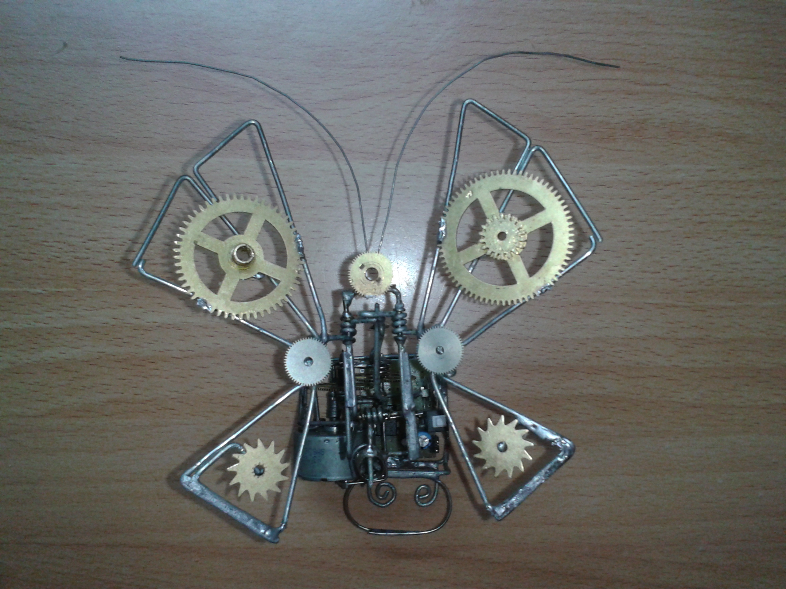 Простите немного отвлеку Вас своей безделушкой , это конечно не паучок со сложной механикой, а так баловство для разнообразия поделок, даже стилем "стимпанк" попахивает немного ну хватит с прелюдией перейдем к делу. Что мы умеем делать, а мы умеем делать только одно - это махать крыльями , но с цикличностью примерно 20-30 сек. машем, потом 5 сек. отдыхаем, разное время работы связано наверно с питанием микрочипа, вместо нужных 5 V у меня батарейка 2,4 V.