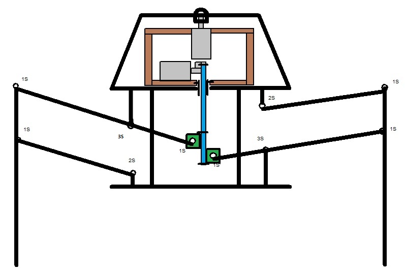Pok Dombrovskiy: можно и так, только верхняя поперечная ось шатуна должна еще в пазах ходить вверх\вниз, что не совсем технологично. Вот в большом белом пауке на видео (то что любит Radist рассматривать) там есть коромысло-журавль для закрепления второй точки шатуна, а привод шатуна точно как и Вы нарисовали.