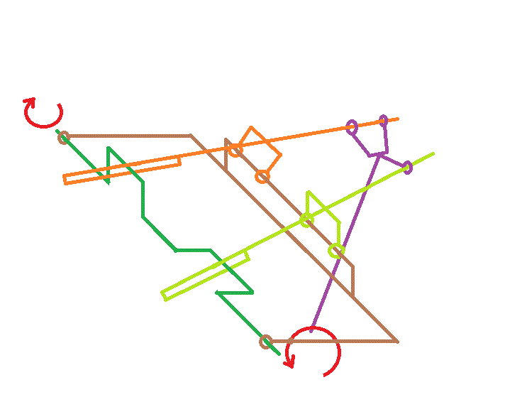 короче говоря, нога шатается на двух рычагах, движение одного рычага на пол хода отстаёт от второго, механизм похож на то что иногда используется в стирлингах http://www.animatedengines.com/ross.html. рычаг на котором подвешен треугольник убирается, а вместо шатунов своеобразные коромысла связанные с коленвалом, попозже нарисую может :)