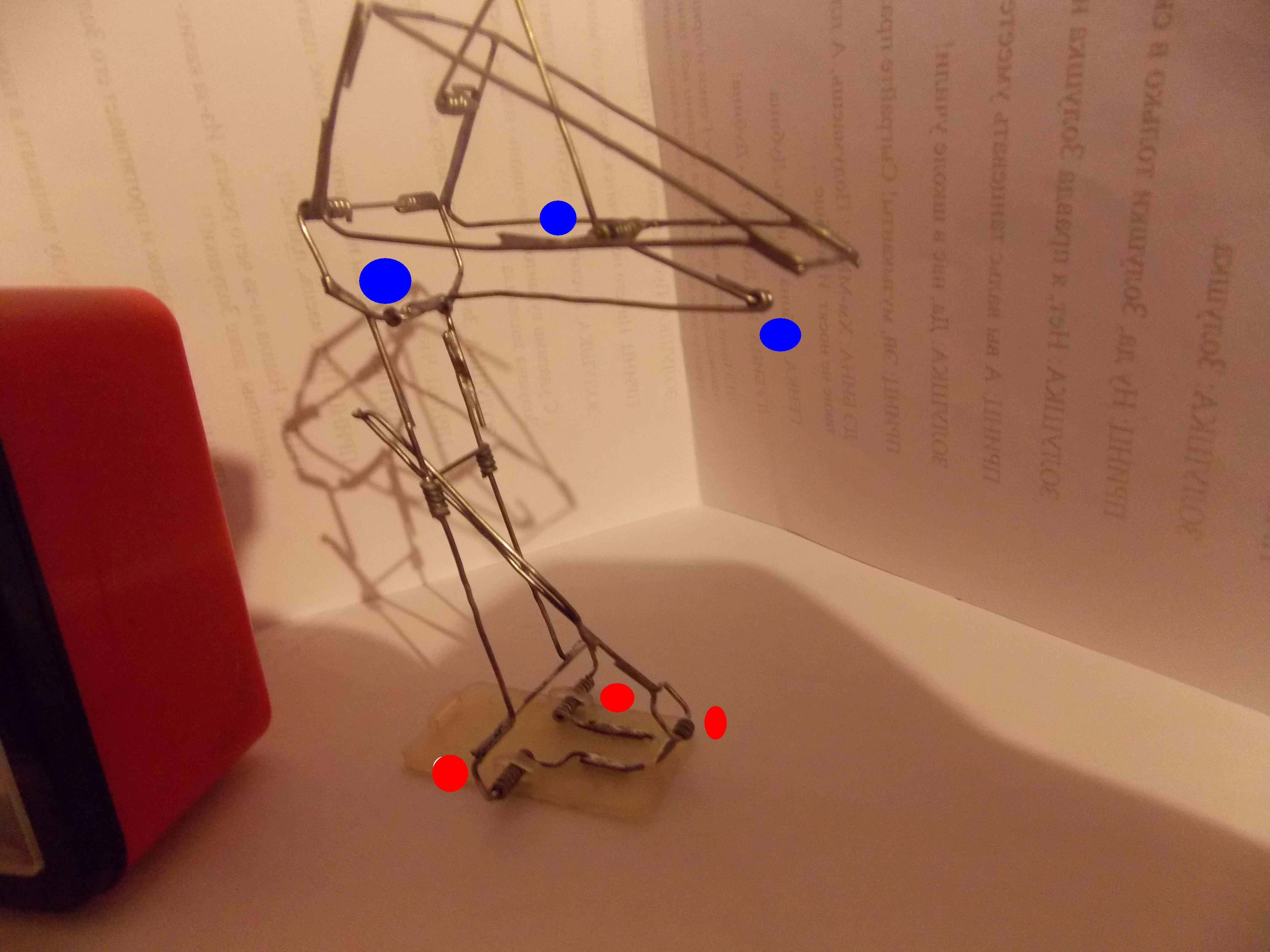 2. Колено - Бедро связанны подвижным шарниром, и приводятся в движенье системой тяг (синие точки) .