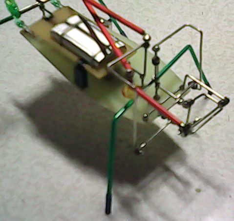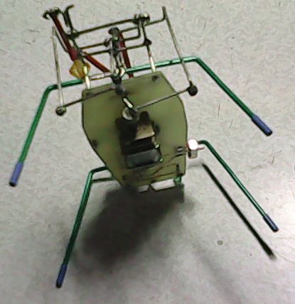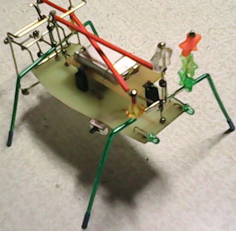 Захотелось сделать робота-богомола, чтоб ходил на четырех ногах, а двумя передними размахивал и крутил головой (это единственное насекомое, которое это может). Из хотелок получилась примерно половина. Кинематическая схема - полуяк, но с четыремя ногами. А "богомольная" часть оказалась и тяжелой (с ней уже не ходит), и слишком далекой от коленвала - движения с трудом доходят и до передних ног, а "руки" должны были быть подключены именно к ним. Так что пока богомола нет, но может кого-нибудь вдохновит на его создание.