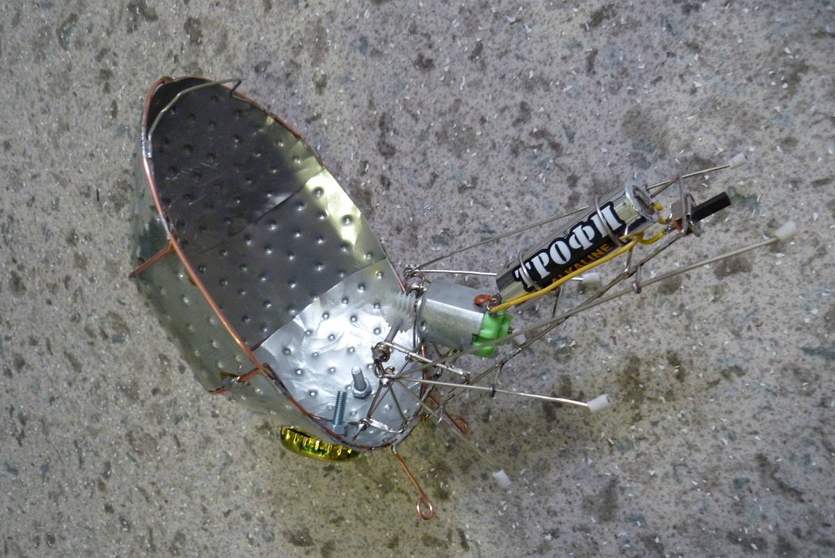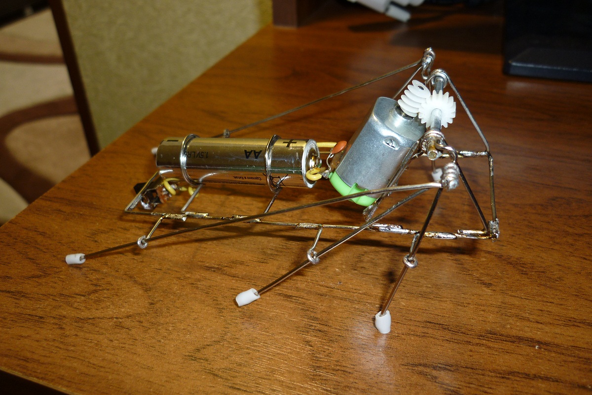Воодушевленный покупкой, уселся паять аналог жука-механика от Сергея. Управился за вечер + днем допаял ноги. Прикольный вышел жук, крепкий и упорный. Если своего предыдущего я боялся отдать малому (4 года), этого даю спокойно - уже полдня играет и не сломал )))