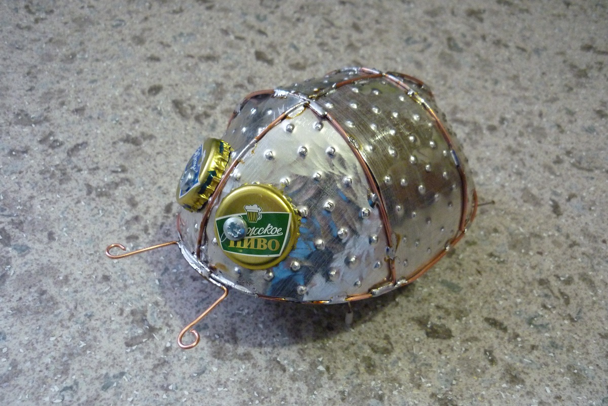 Забронировал жука, как и обещал. Планировалась божья коровка, но что-то он с клепками стал слишком брутальный, поэтому разукрашивать в красный и черный не стал. Верх сделал "капотом" для удобного доступа к внутренностям.