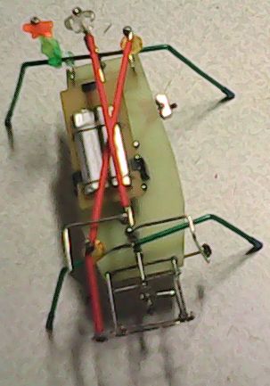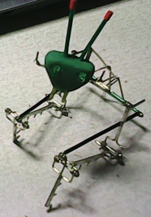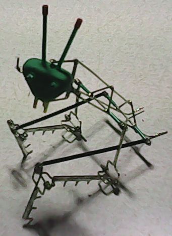 Захотелось сделать робота-богомола, чтоб ходил на четырех ногах, а двумя передними размахивал и крутил головой (это единственное насекомое, которое это может). Из хотелок получилась примерно половина. Кинематическая схема - полуяк, но с четыремя ногами. А "богомольная" часть оказалась и тяжелой (с ней уже не ходит), и слишком далекой от коленвала - движения с трудом доходят и до передних ног, а "руки" должны были быть подключены именно к ним. Так что пока богомола нет, но может кого-нибудь вдохновит на его создание.