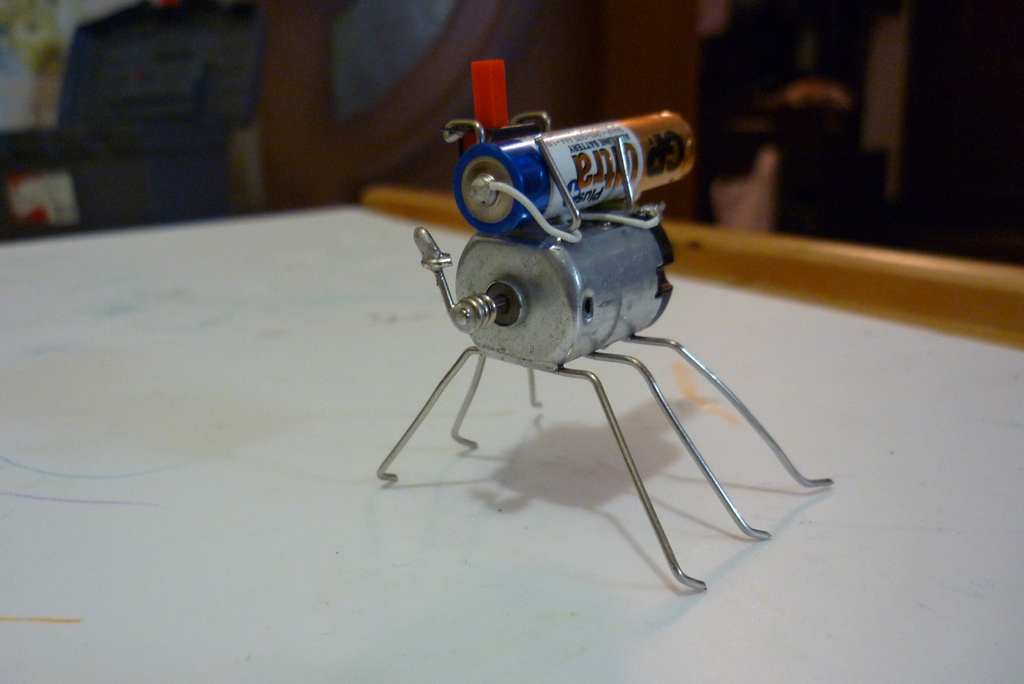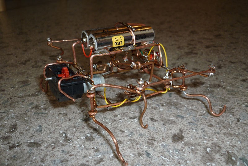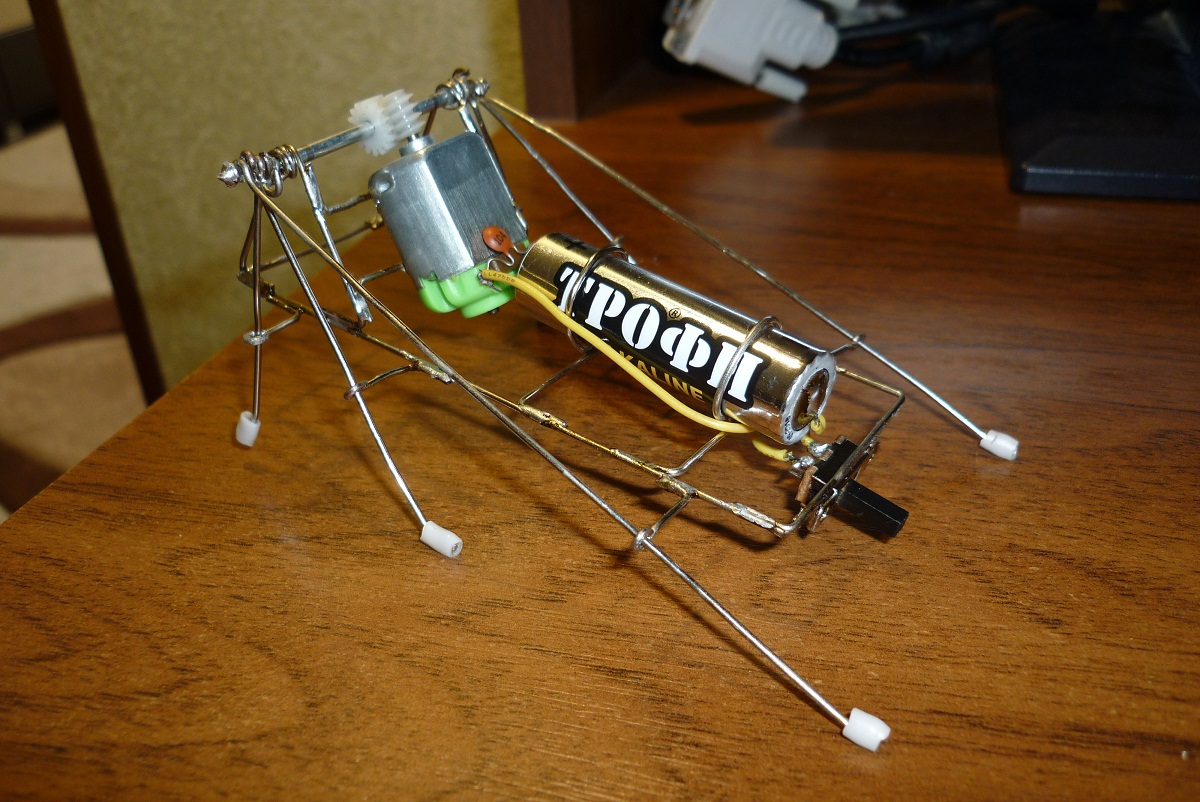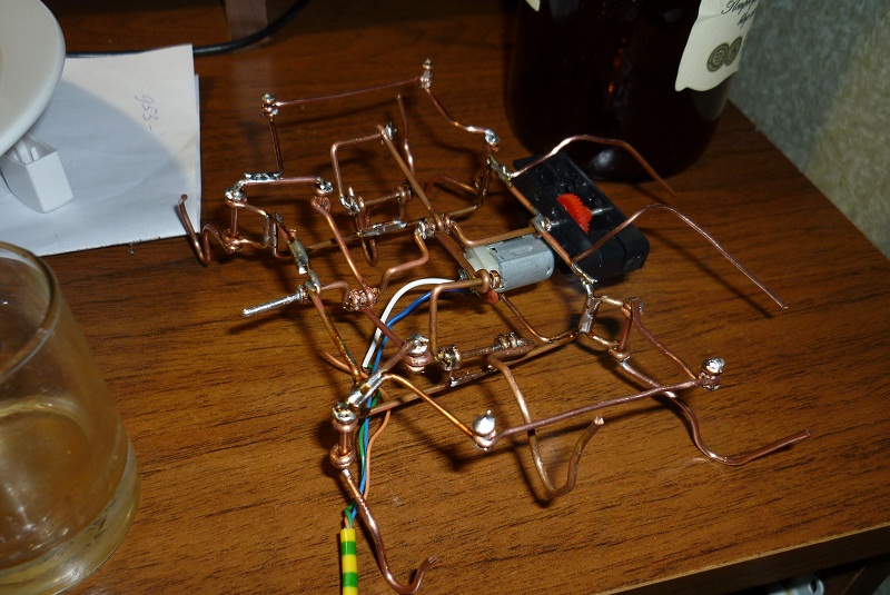 6 вечеров за работой (по 1-2 часа), и еще несколько вечеров на чтение форума. В итоге родился этот зверь. Делать его решил из медного провода на 2.5, благо он паяется хорошо, достаточно жесткий и доступен в любом магазине. Редуктор добыл из сломанной инерционной машинки сына. Основную ось вынул и поставил туда коленвал, для уплотнения оставил на нём кусок его же изоляции - шестерня как раз туго встала на него. Моторчик - из сломанной радиоуправляемой машинки. Как делал - видно на фотках и видео. Много косяков, конечно, допустил, но тем не менее паук бегает и пугает собой жену и тёщу ))) Под конец накрутил на лапы паука несколько обрезков от пипетки, чтобы не проскальзывало. Стал заметно резвее бегать.