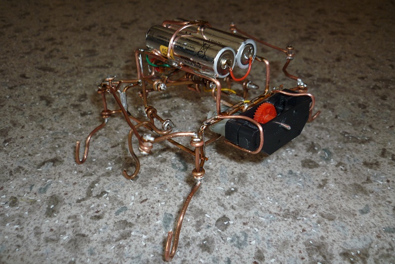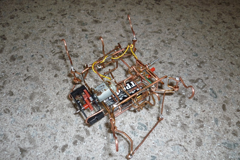 вот это подход, это я понимаю - всё показано и разжёвано, куча роликов, все дела пара технических соображений: ещё одну шестерню хотя бы, чтоб не тратил всю энергию на пустые пробуксовки; или ноги сделать эластичные - стабильнее побежит (можно из резины нарезать или ещё чего-нибудь такого); либо сократить амплитуду движения средним ногам, чтоб поменьше опускались-поднимались - точки опоры будут дольше находиться на полу, опять же потопает ровнее.. как-то так... Медь это конечно так себе, но уж, как понимаю, что есть, то есть ))