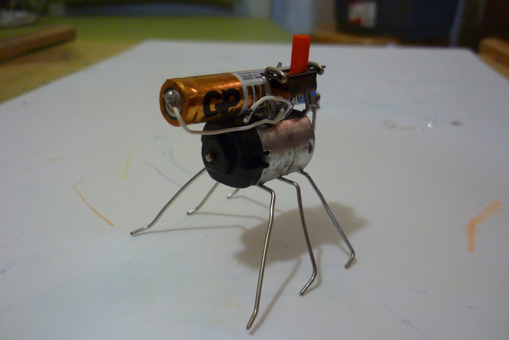 Воодушевленный покупкой, уселся паять аналог жука-механика от Сергея. Управился за вечер + днем допаял ноги. Прикольный вышел жук, крепкий и упорный. Если своего предыдущего я боялся отдать малому (4 года), этого даю спокойно - уже полдня играет и не сломал )))