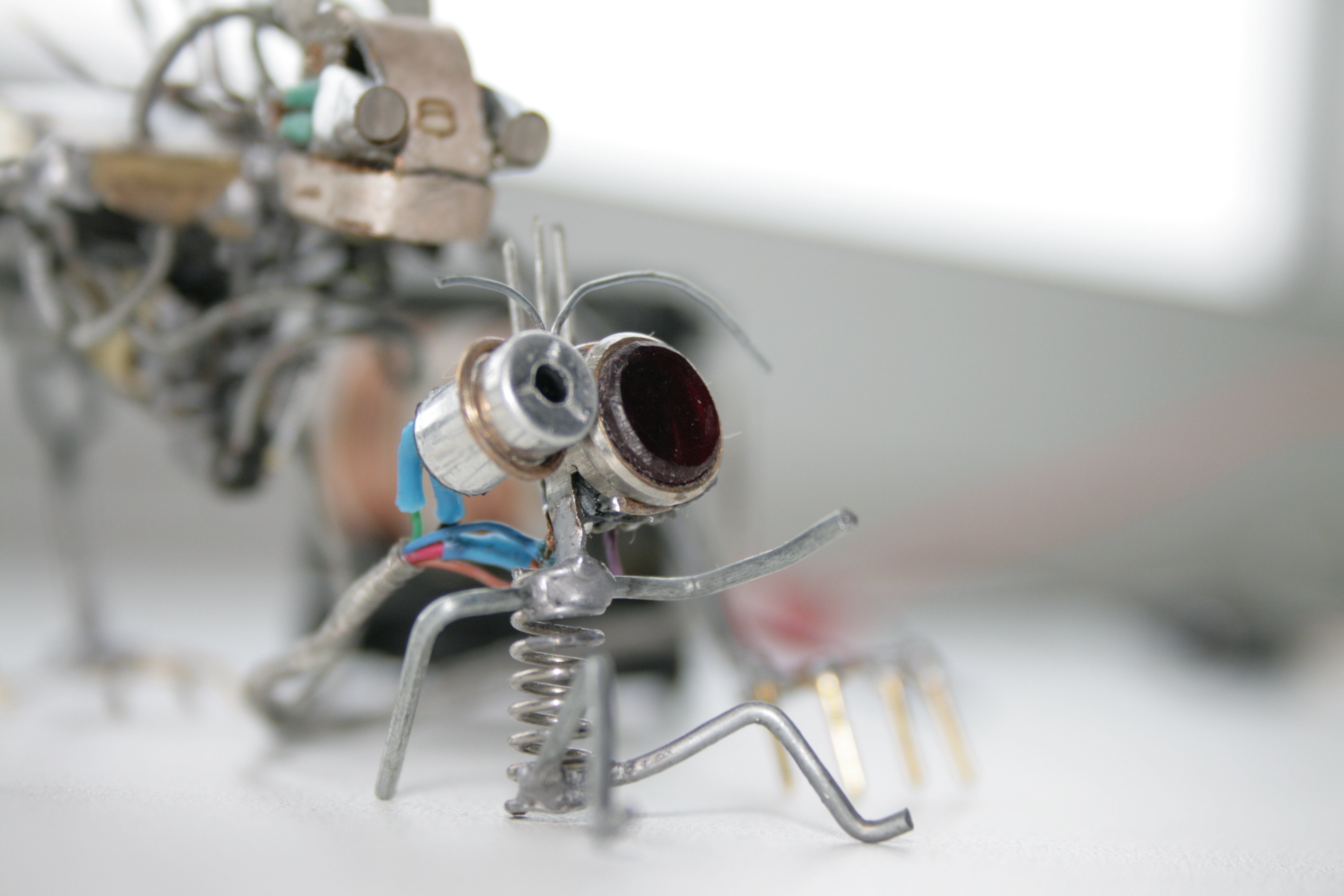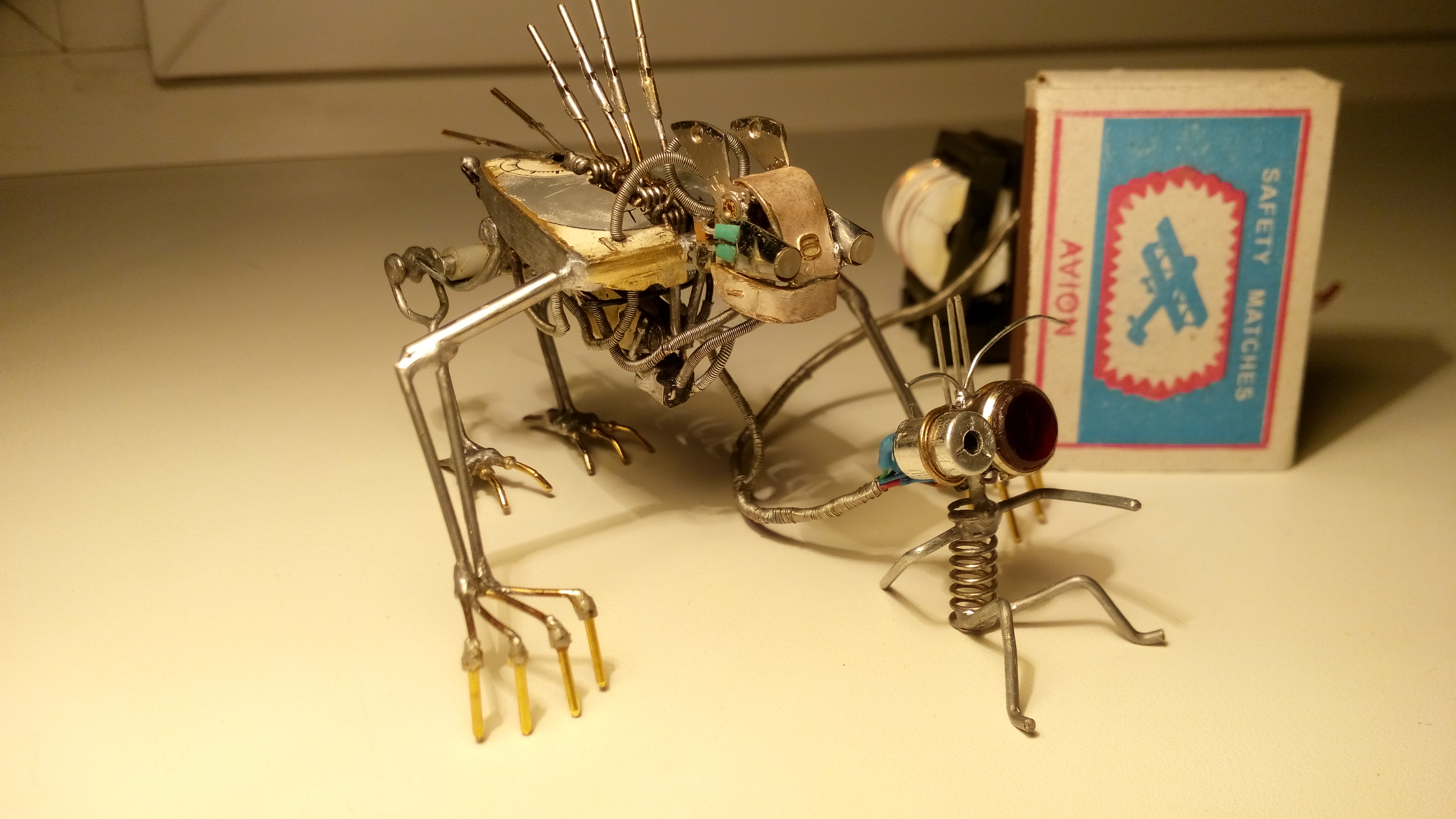 угу )) если честно, то этого песика я скопировал, ну почти скопировал. У дяденьки с просторов инета они статичны, а я решил немного динамики добавить, ну не дело творениям без движения стоять )) у него поделки просто огонь. Незнаю, ссылку его можно выложить ? если нельзя то можно набрать в поисковике "стимпанк поделки своими руками" и характерный стиль сразу там можно по фото найти, у него букарашки разные из запчастей часов, ну например фото паучка с лампой накаливания вместо брюшко ))