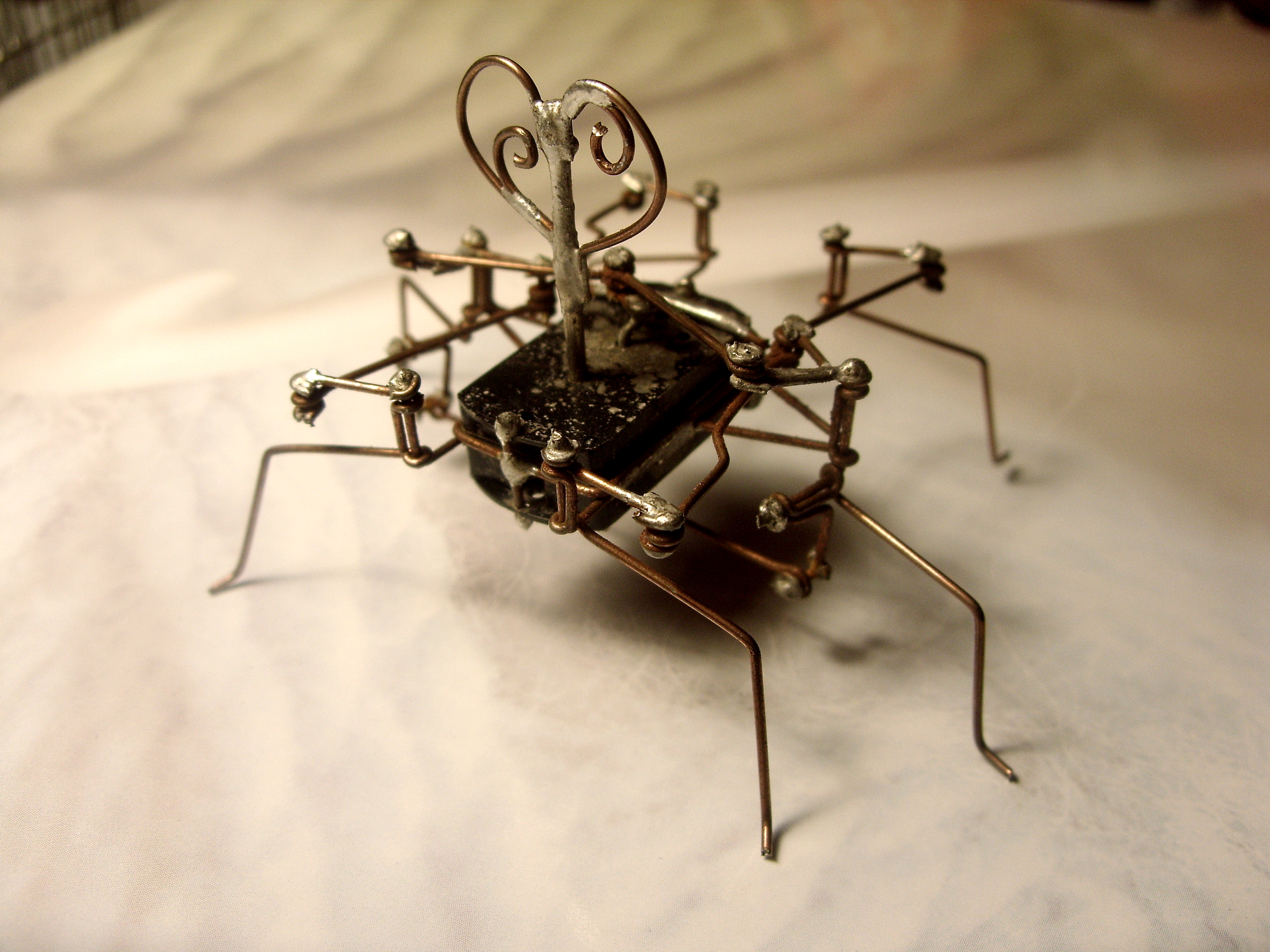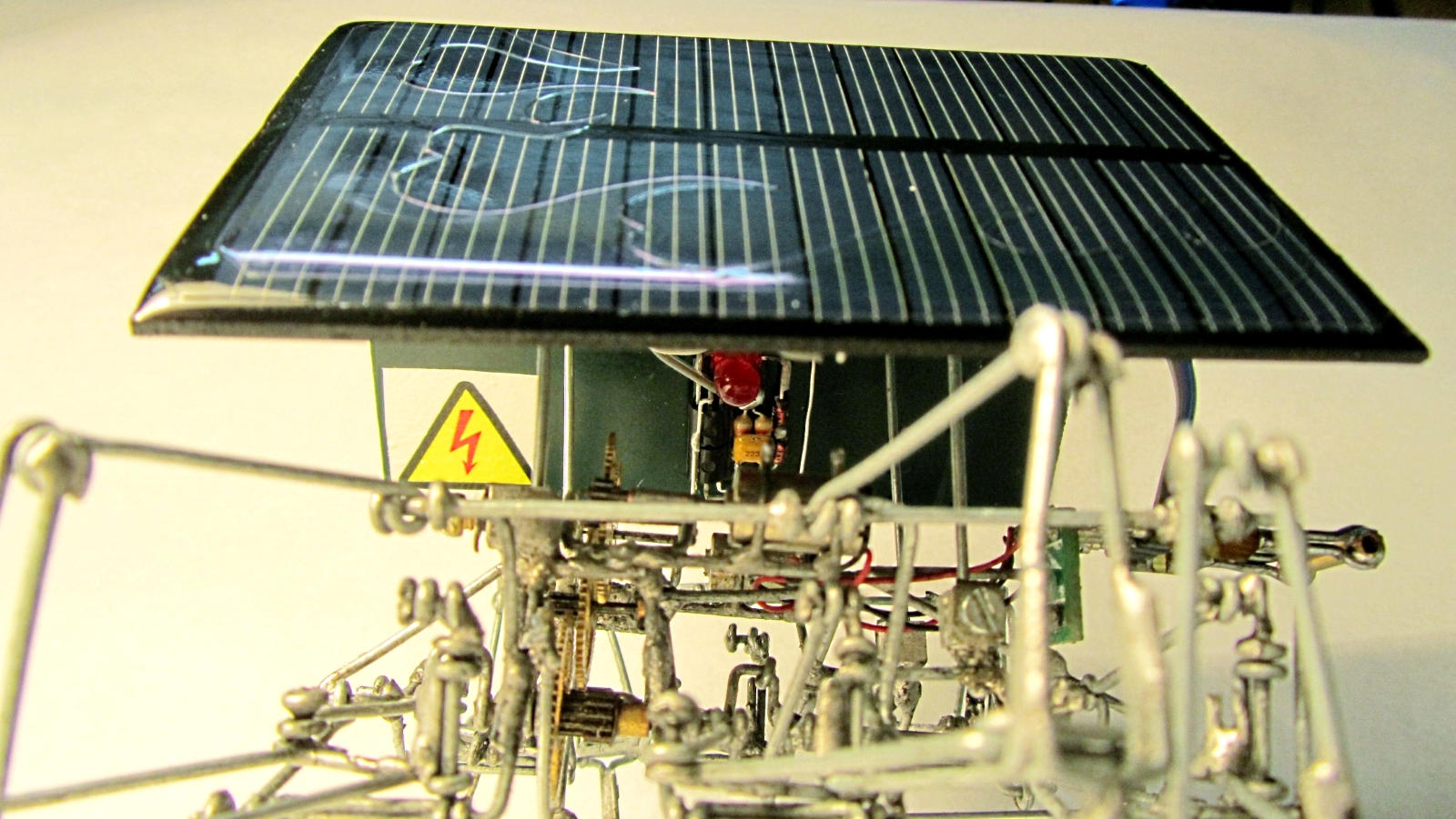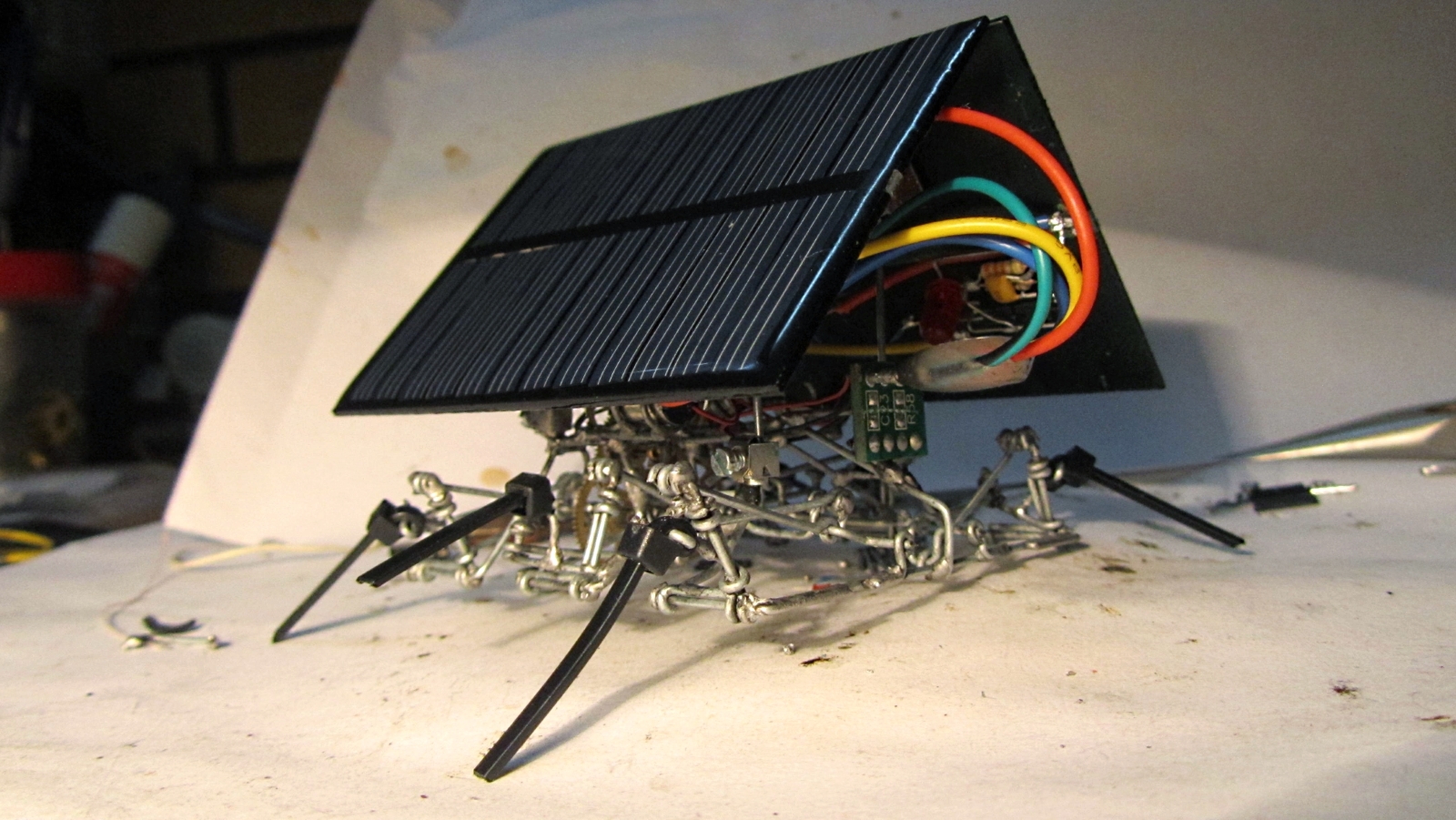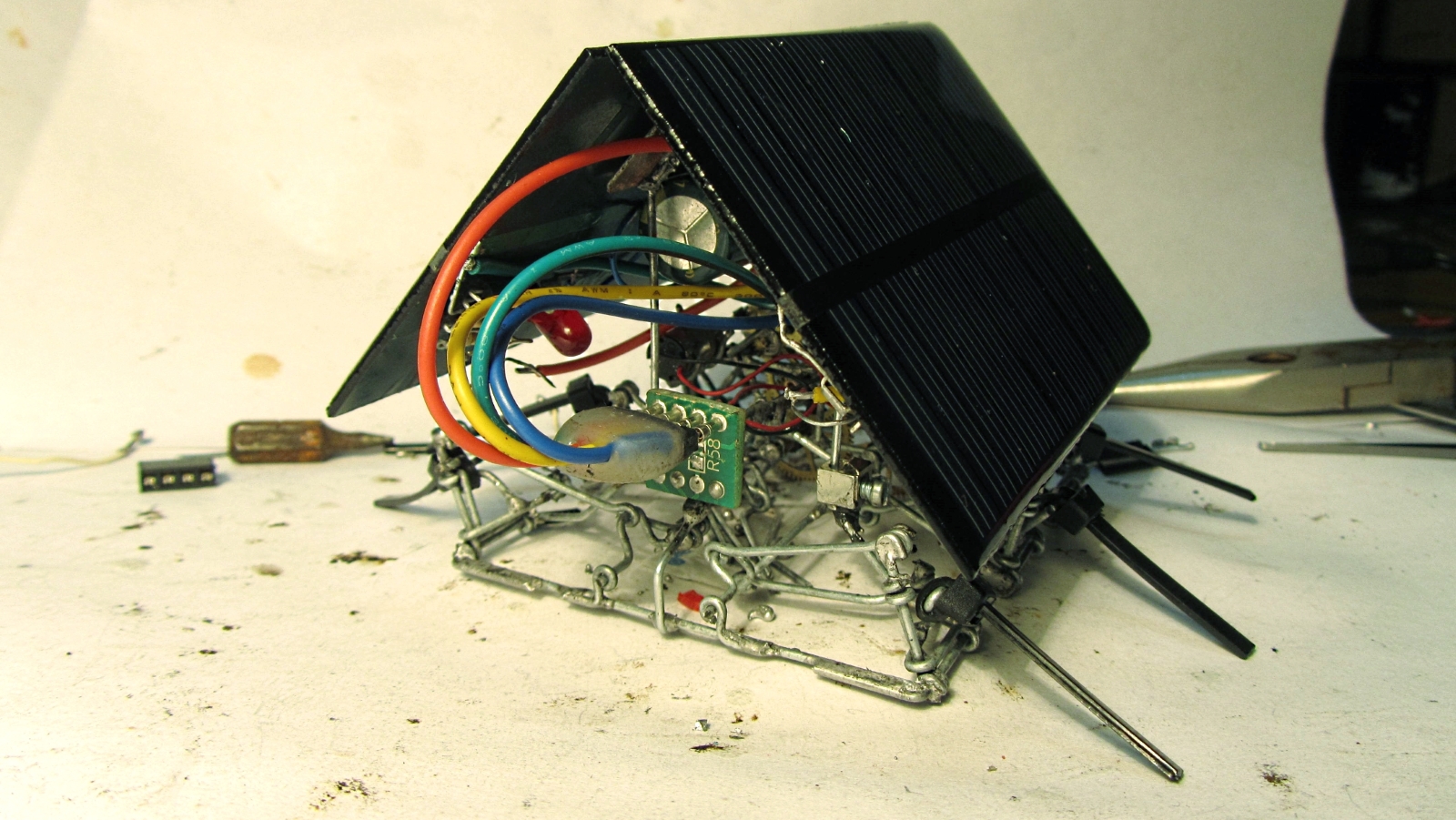 Это хоть и Бим, но проволоки в нём куды больше, чем мозгов. Поэтому большую часть материалов сюды, и пару слов в "Бимы". ___________________ Сия особь представляет из себя разжиревшего Странника. Всё немного раздалось: панельки побольше (6V/0.6W против 5V/0.15W), в ногах по ещё одному коленцу, напруга срабатывания поднята парой диодов с 2.6V до 4V - следовательно, шаги получаются реже, чем без них, но выходят куда мощнее. 93-граммовый огород топает к свету уверенно и непреклонно, сметая и переворачивая прочих бимов на своём пути. Пока думал над названием, получился Бегемот ___________________ Пара фоток и киношка: