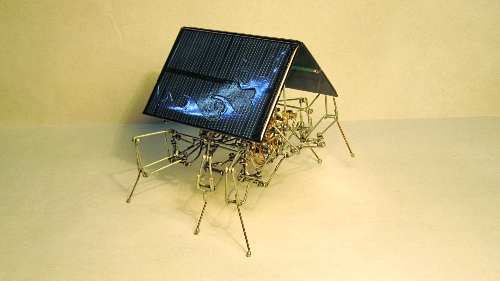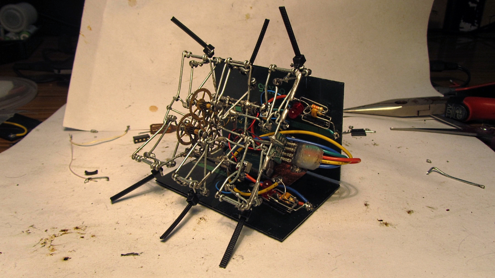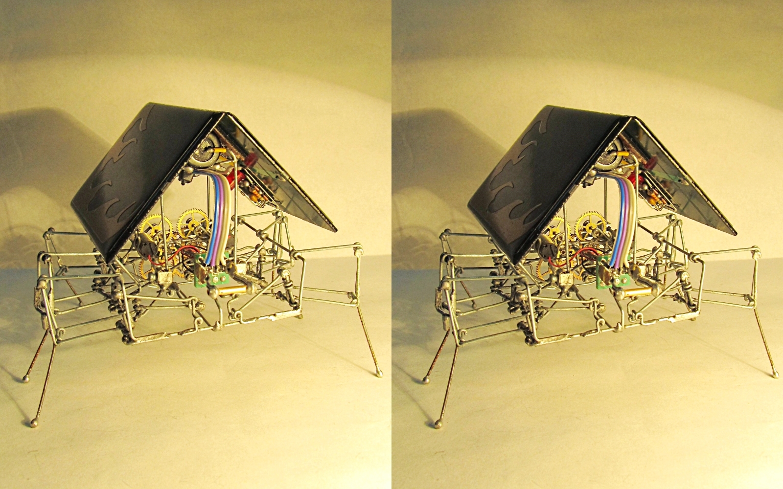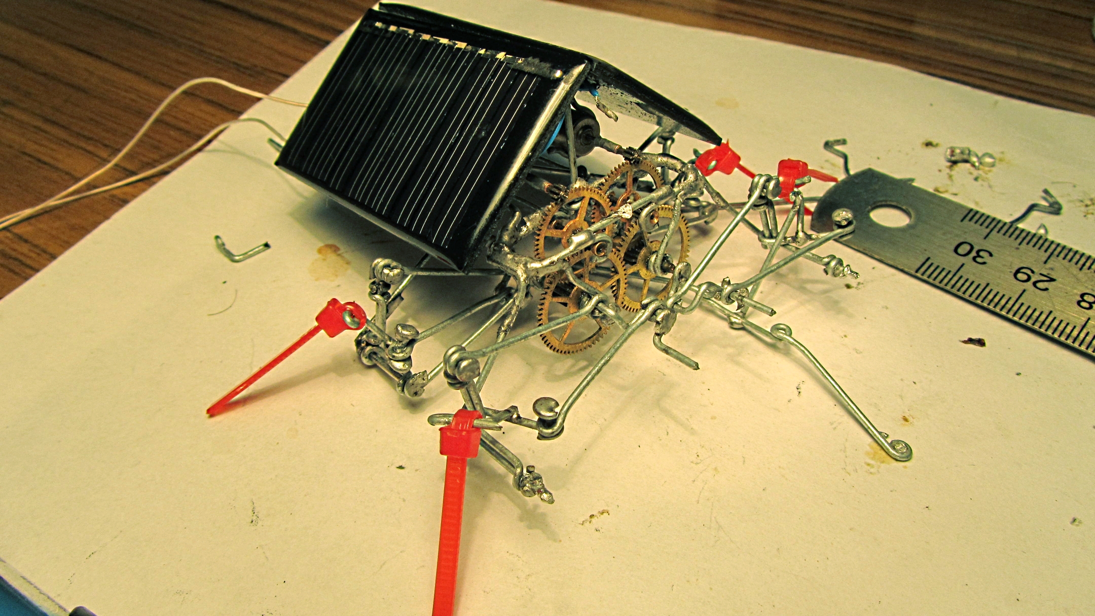 Это хоть и Бим, но проволоки в нём куды больше, чем мозгов. Поэтому большую часть материалов сюды, и пару слов в "Бимы". ___________________ Сия особь представляет из себя разжиревшего Странника. Всё немного раздалось: панельки побольше (6V/0.6W против 5V/0.15W), в ногах по ещё одному коленцу, напруга срабатывания поднята парой диодов с 2.6V до 4V - следовательно, шаги получаются реже, чем без них, но выходят куда мощнее. 93-граммовый огород топает к свету уверенно и непреклонно, сметая и переворачивая прочих бимов на своём пути. Пока думал над названием, получился Бегемот ___________________ Пара фоток и киношка: