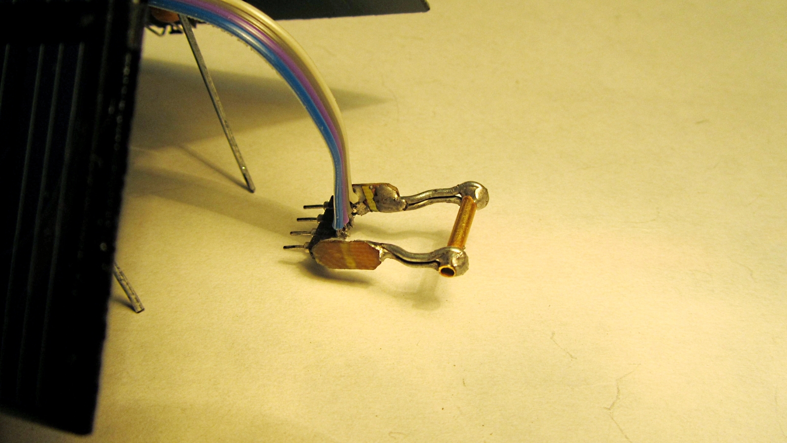 Дабы тварь получилась разборная и более менее ремонтопригодная (наперекор собственным традициям) - моторы съёмные и с регулируемым положением, съёмная "крыша" (хотел так у Странника сделать, но пожалел его силёнки), отключаемые от моторов мозги. Импровизированный разъёмчик - нормального отродясь в руках не было.