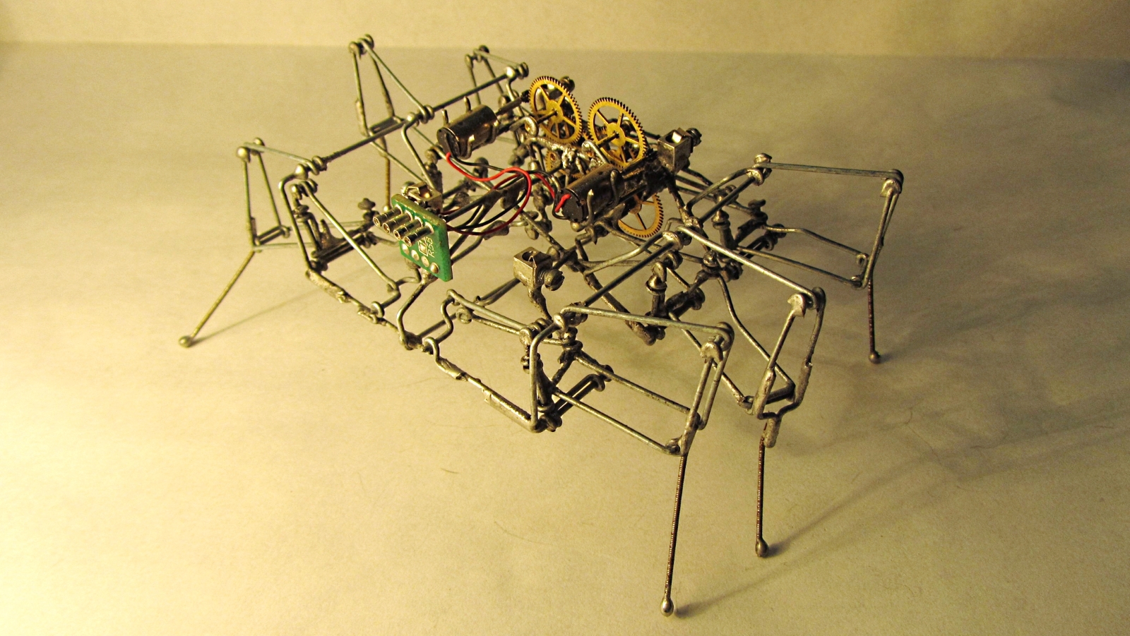 Готовая ходовая. "Бёдры" жёсткие, ибо рычаги да тяги. "Голенища" - струны: какая-никакая эластичность неплохо показала себя везде, где бы ни применялась. Напротив, вспомним Брудлинга с жёсткими ногами - насмерть заклинивает всей тушкой, как только что-то остановит одну из культяпок.