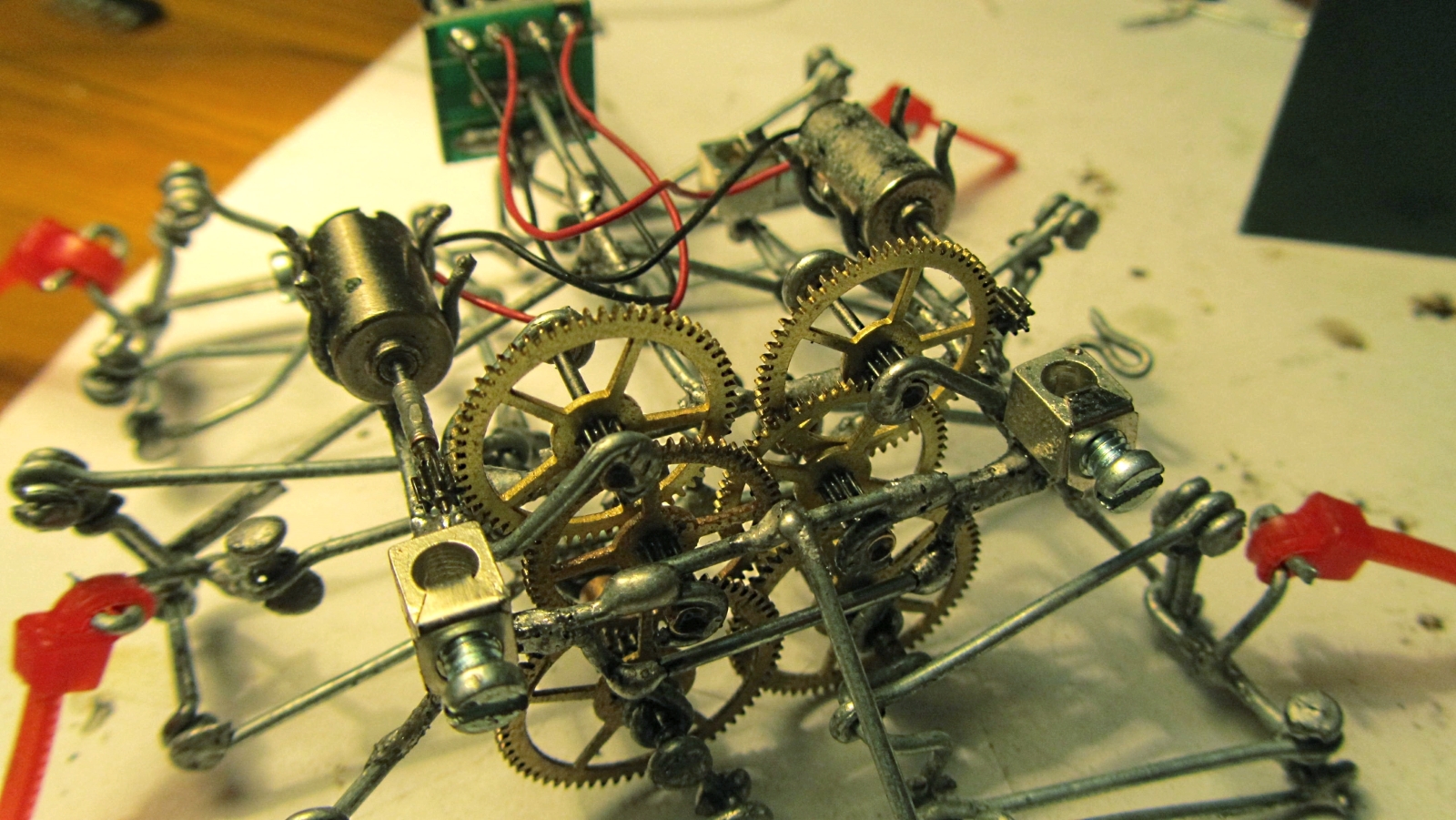 Очередной отладочный вариант. С конструкцией ног уже определился.. Думал, хватит пары шестерёнок на половинку, и тех же небольших панелек, как у Странника. Да где уж там.
