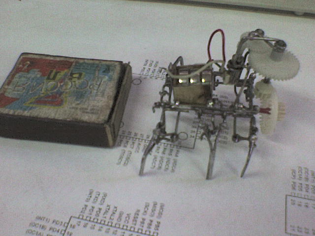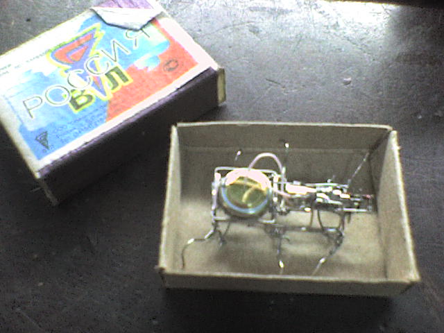 Всем доброго времени суток !!! Прикольная тема.. Вот попроб-л сам. Просьба сильно не пинать, всё на глаз, без линейки, так-что бегает может и криво.. Единственное нововведение от остальных (может что и пропустил) - это двигатель от телефонного вибратора, и размер.. хотя можно было и ещё меньше. Фотки: