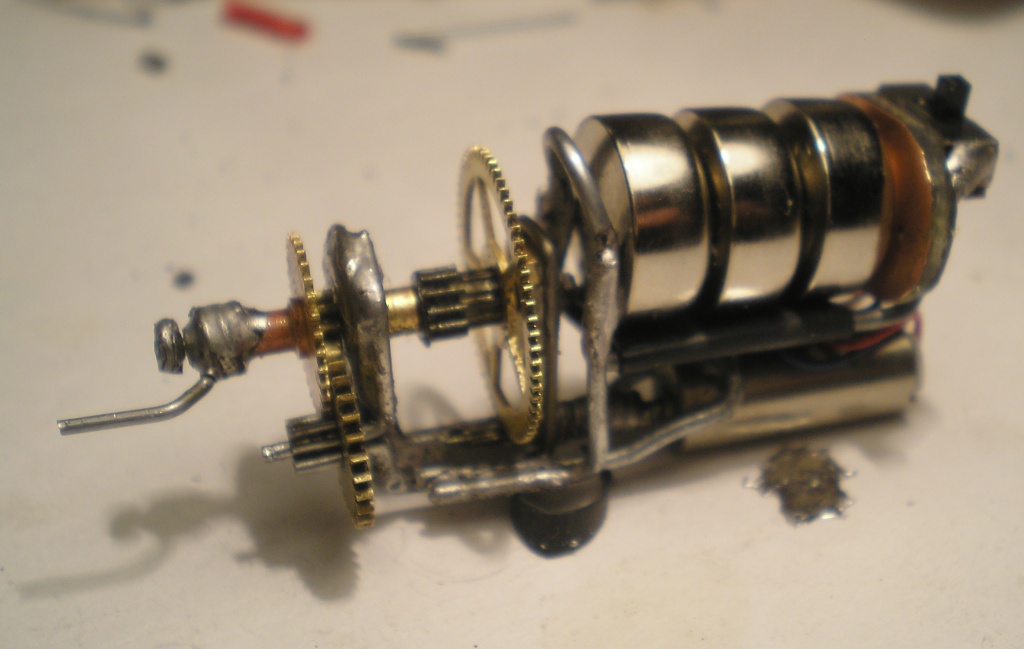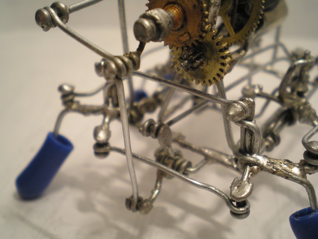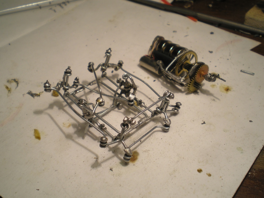 А я пока пытался замутить тварюшку, чтоб ноги у неё не в одной линии двигались, а окружно. При этом не повторяя свои предыдущие конструкции. Хотел по подобию фазановского проволочника замутить, но постоянно получал заклинивающие узлы. Или просто подсознательно повторять не хотел... Хрен его знает. Пришлось заново чего-то изобретать, породив по пути во всех отношениях мёртвое шасси, в последствии отпаянное от мотора с редуктором, и повешанное на стену.