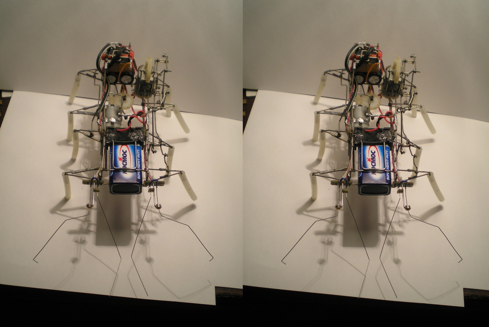 ), воткнул какие никакие контактные усы (глаза делать ему не стал - оно настолько тупое и медлительное, что с ориентацией на всет вообще больше бы топталось на месте, чем ходило) - и получил очередную рамку с культяпками с нелепой походкой: ноги двигаются по-шалтайски, тоесть одни вверх-вниз, другие вперёд-назад, половинки несинхронизированы, и когда сама собой возникает смена фазы, мы видим бугагачную попытку ползти голопом