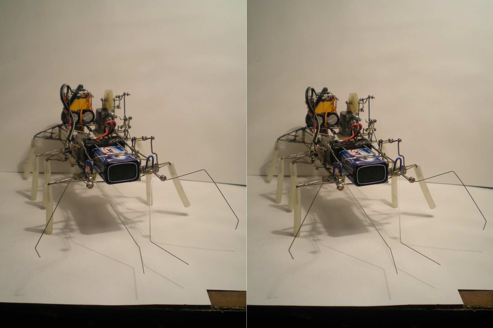 ), воткнул какие никакие контактные усы (глаза делать ему не стал - оно настолько тупое и медлительное, что с ориентацией на всет вообще больше бы топталось на месте, чем ходило) - и получил очередную рамку с культяпками с нелепой походкой: ноги двигаются по-шалтайски, тоесть одни вверх-вниз, другие вперёд-назад, половинки несинхронизированы, и когда сама собой возникает смена фазы, мы видим бугагачную попытку ползти голопом