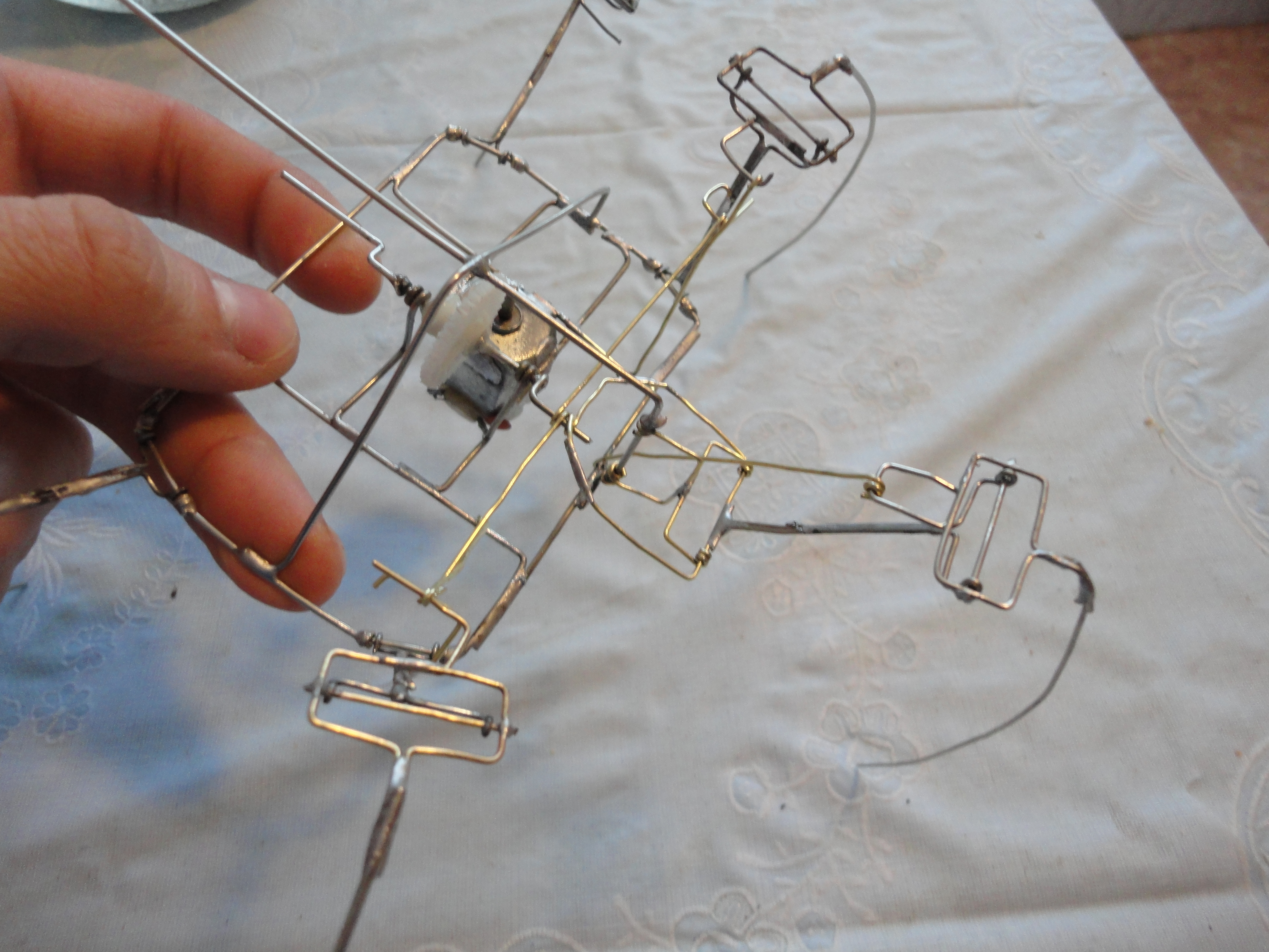 Почти получилось... почти. почти даже ходит, но инвалид. Вот что получилось изготовить за сегодняшний вечер, перекроил заново весла средних лап, сделал аккуратнее и одинаковые. Протянул тяги ко всем лапам от кривошипов, рассчитать как они должны я не знаю как, расставил по симметрии по одному положению кривошипа (тут нужна подсказка). Сами ноги тоже пока не понял какой надо длины делать и одинаковы ли они все, сделал одинаковыми по длине и конфигурации (тут тоже нужна подсказка). Вобщем вот фото: