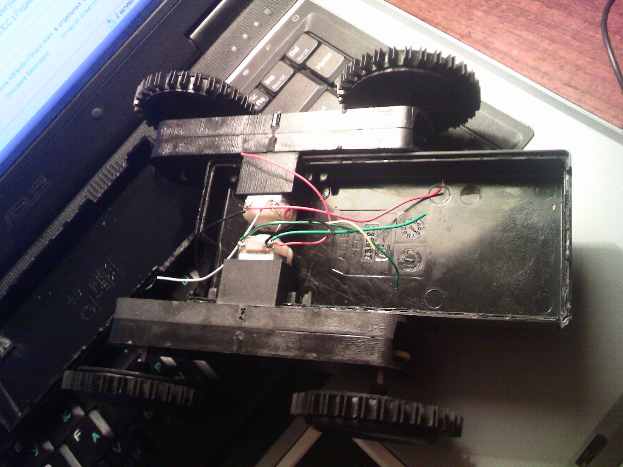 Собсна редукторы взяты из финольных китайский "игрушек", а сам корпус взят от строго блока питания. Оси срезаны. К корпусе проделаны дырки по очертаниям креплений двигателя - редуктор с двигателем туда свободно вставляются и вытаскиваются. Клеить не буду, лучше прикручу, но пока болтов подходящих не видел в продаже. Редукторы поставил не по центру для того чтобы была возможность поместить плату внутрь корпуса, места довольно много, но батарейки придется все же приделать снаружи. А самый положительный момент в том, что вся верхняя часть корпуса свободна - это гораздо эстетичнее чем куча торчащих, за все цепляющихся проводов, ну или в конце концов можно туда приделать манипулятор, или еще что - нибудь более интересное. Эх мечты мечты ) Смотрим фотки!
