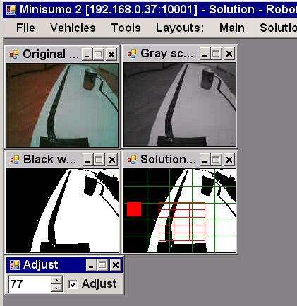 По алгоритму: на картинке видно, что видит робот. Красным выделены анализируемое пространство. a) сделать gray-scale image b) сделать black-white image c) поделить на 3 колонки d) для первой строки (ближайшей к роботу), если черного больше слева - едем налево, справа - направо. Если в центре, то считаем следующую строку, бывает что можно дать газу если дорога прямо идет Вот и все. Корректируем путь 50 раз в секунду. IMHO, потенциал шасси не раскрыт до конца, причин для переделки пока не вижу. Для сравнения, банка 0.33 виднеется вдали.