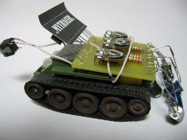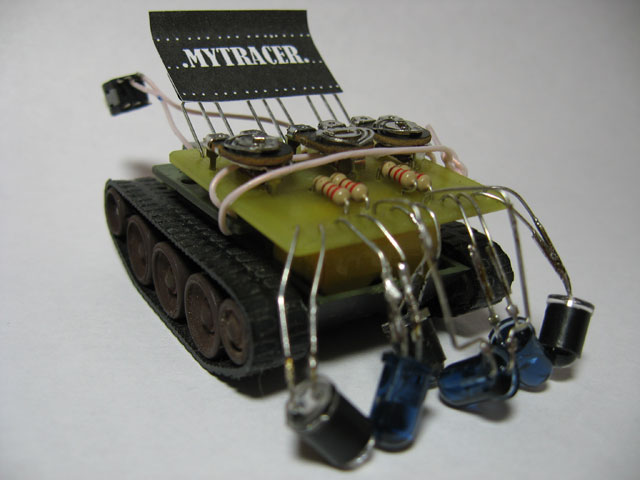 Три датчика, три транзистора, танковое шасси. Батарея 4,8В*150мА.