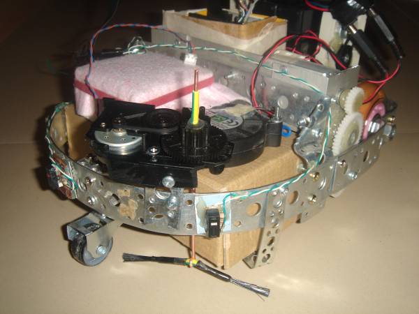 Чтобы робот не простаивал между делами, нужно сделать радиальную щетку - без нее плохо. С утра - перед работой - сделал первый вариант. Использовал механику из привода лотка CD-ROM-а. Ничего дорабатывать не пришлось - медную жилу из трехжильного электрокабеля протолкнул в готовое отверстие в оси шестеренки, сверху к ней приклеил термоклеем кусок изоляции с этой-же жилы - удобно регулировать высоту оси щетки (потом можно завиксировать клеем или просто изогнув). Основание усов щетки также сделал из куска жилы, прикрепив термотрубкой пучки щетины от щетки.